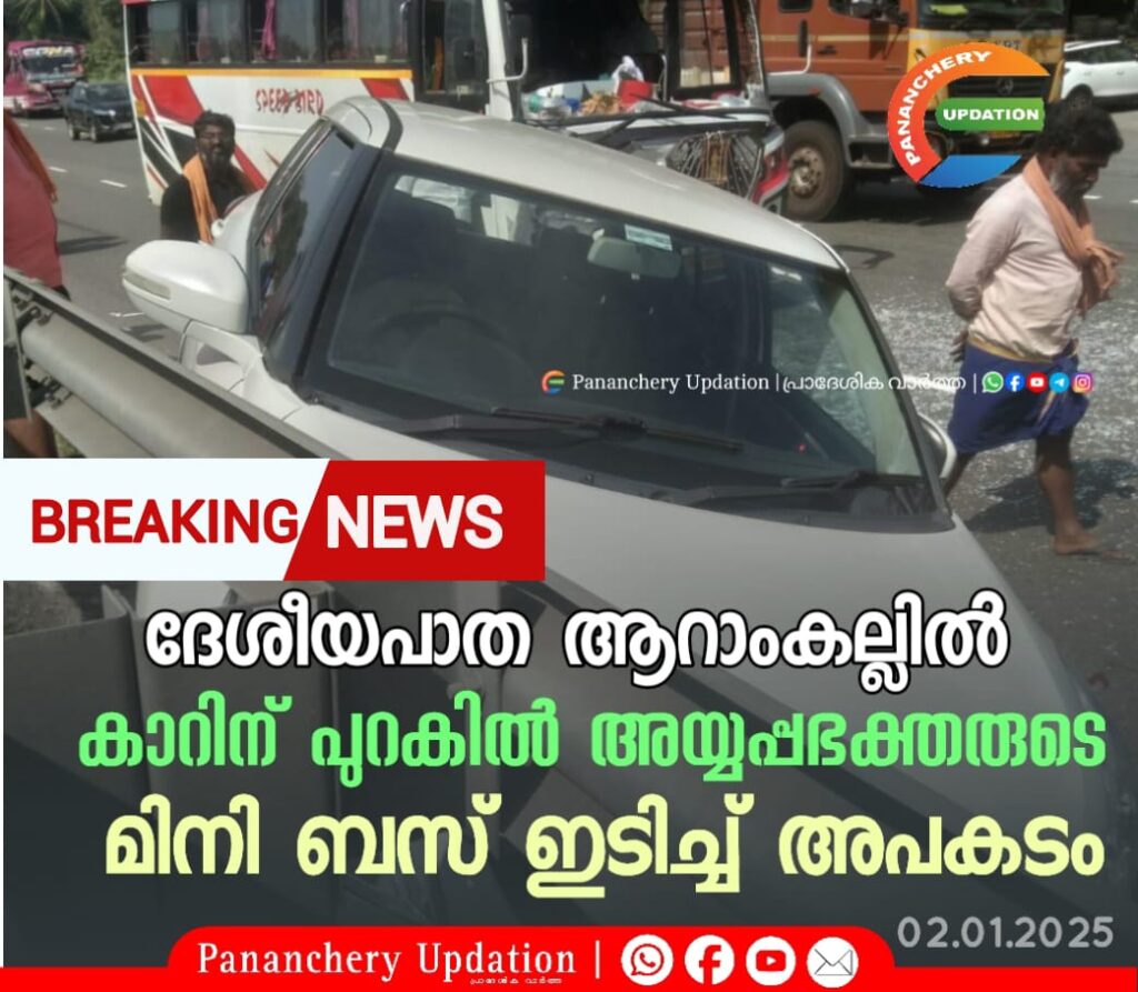 ദേശീയപാത ആറാം കല്ലിൽ കാറിന് പുറകിൽ അയ്യപ്പഭക്തരുടെ മിനി ബസ് ഇടിച്ച് അപകടം