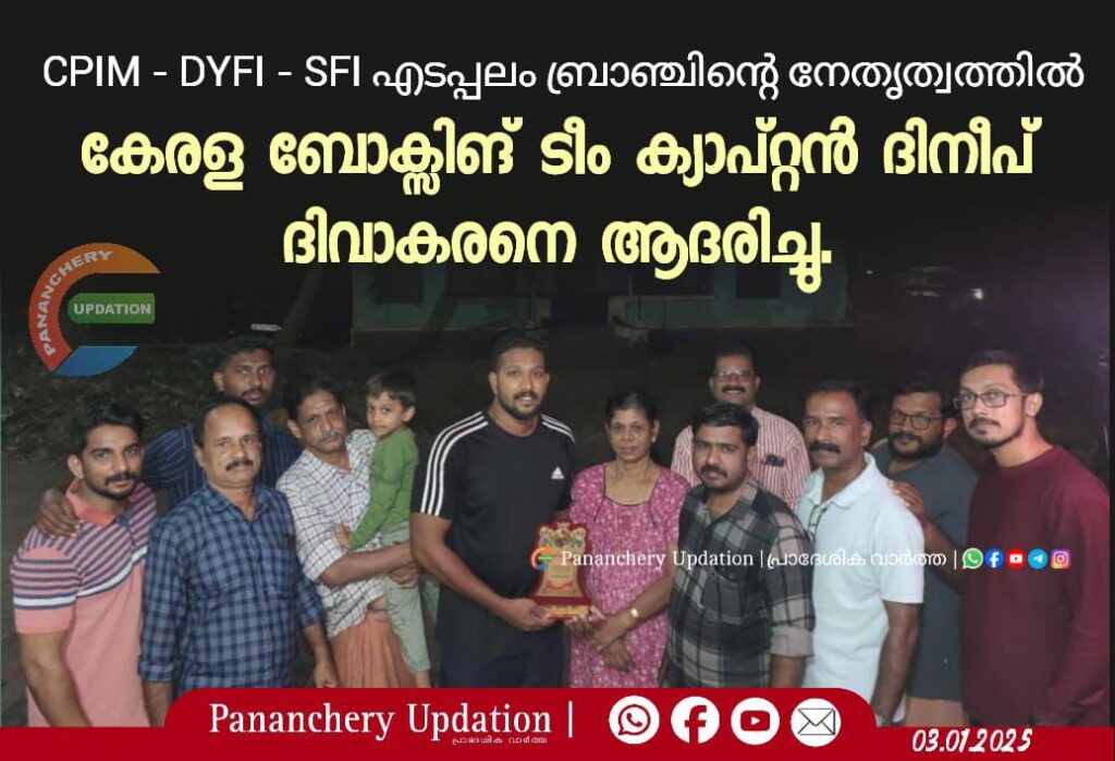 CPIM – DYFI – SFI എടപ്പലം ബ്രാഞ്ചിൻ്റെ നേതൃത്വത്തിൽ കേരള ബോക്സിങ് ടീം ക്യാപ്റ്റൻ ദിനീപ് ദിവാകരനെ ആദരിച്ചു.