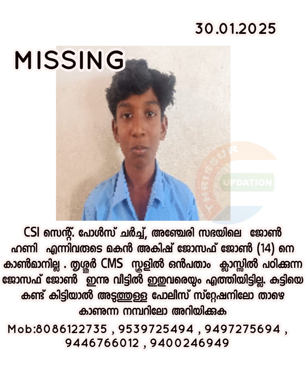 CSI സെന്റ്. പോൾസ് ചർച്ച്, അഞ്ചേരി സഭയിലെ ജോൺ ഹണി എന്നിവരുടെ മകൻ അകിഷ് ജോസഫ് ജോൺ (14) നെ കാൺമാനില്ല .രാവിലെ കുട്ടി വീട്ടിൽ നിന്ന് സ്കൂളിലേക്ക് പൊന്നു, എന്നാൽ ഇന്ന് കുട്ടി സ്കൂളിലും ഇന്ന് എത്തിയിട്ടില്ല, 7 മണി വരെയും കുട്ടിയെ കാണാതെ ആയപ്പോൾ ആണ് വീട്ടുകാർ സംഭവം അറിയുന്നത് തൃശ്ശൂർ CMS സ്കൂളിൽ ഒൻപതാം ക്ലാസ്സിൽ പഠിക്കുന്നു . കുട്ടിയെ കണ്ട് കിട്ടിയാൽ അടുത്തുള്ള പോലീസ് സ്റ്റേഷനിലോ താഴെ കാണുന്ന നമ്പറിലോ അറിയിക്കുക