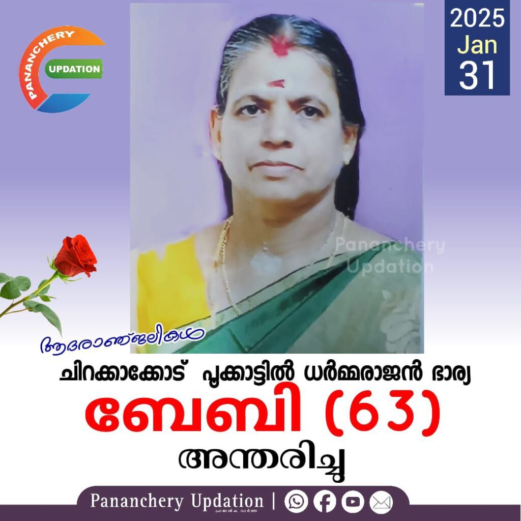 ചിറക്കാക്കോട് പൂക്കാട്ടിൽ ധർമ്മരാജൻ ഭാര്യ ബേബി (63) അന്തരിച്ചു.