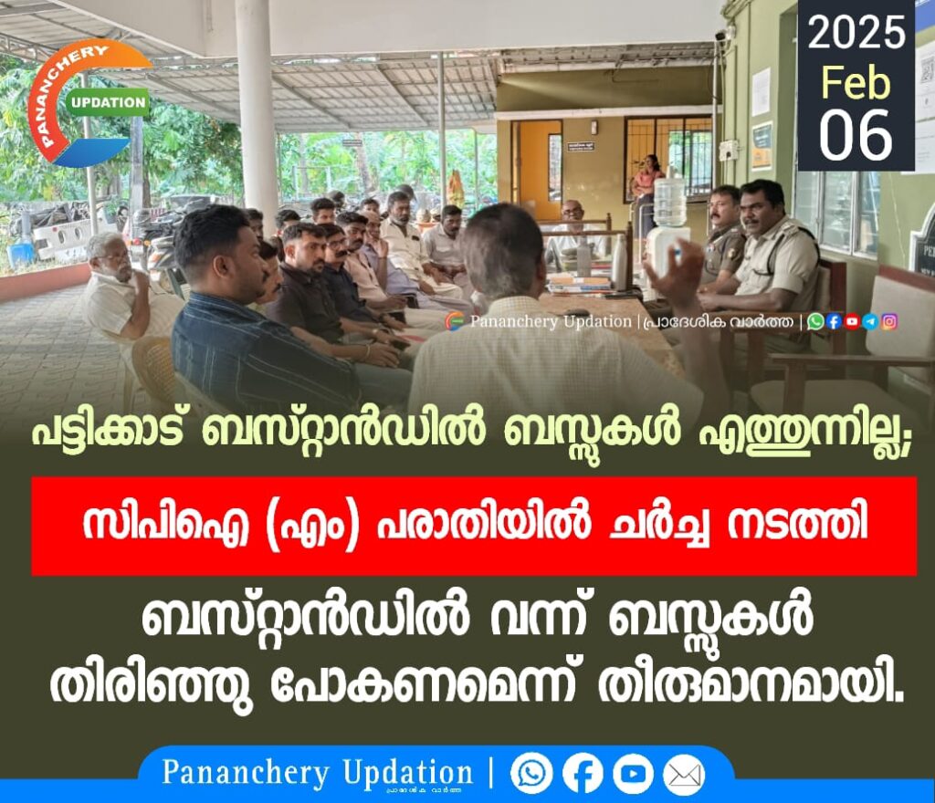 പട്ടിക്കാട് ബസ്റ്റാൻഡിൽ ബസ്സുകൾ എത്തുന്നില്ല; സിപിഐ (എം) പരാതിയിൽ ചർച്ച നടത്തി ബസ്റ്റാൻഡിൽ വന്ന് ബസ്സുകൾ തിരിഞ്ഞു പോകണമെന്ന് തീരുമാനമായി.