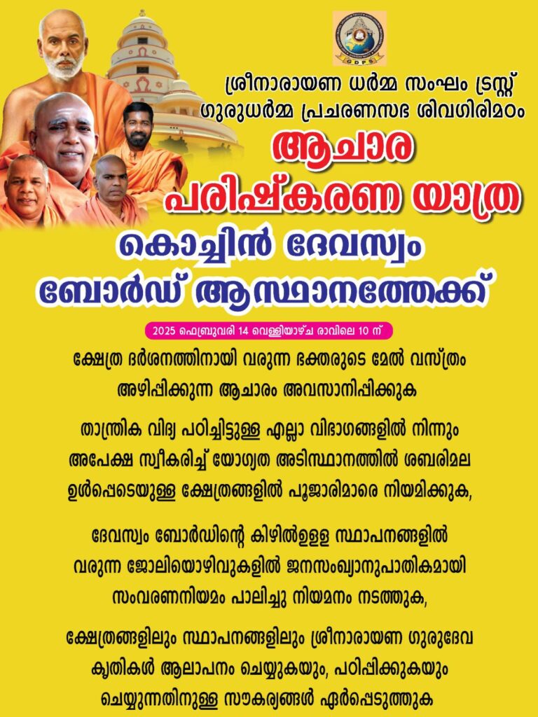 ശ്രീനാരായണ ധർമ്മ സംഘം ട്രസ്റ്റ് ഗുരുധർമ്മ പ്രചരണസഭ ശിവഗിരിമഠം ആചാര പരിഷ്കരണ യാത്ര