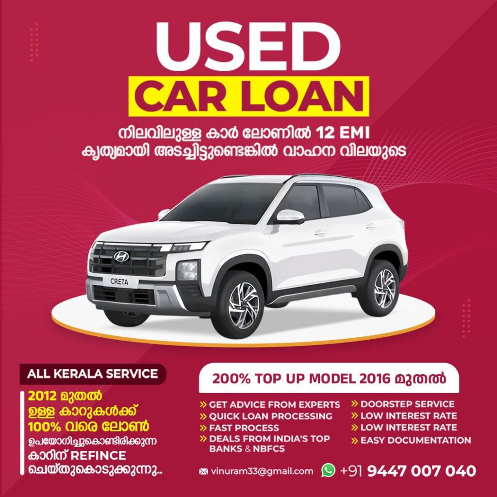 2012 മുതൽ ഉള്ള കാറുകൾക്ക് 100% വരെ ലോൺ ഉപയോഗിച്ചുകൊണ്ടിരിക്കുന്ന കാറിന് REFINCE ചെയ്തുകൊടുക്കുന്നു..