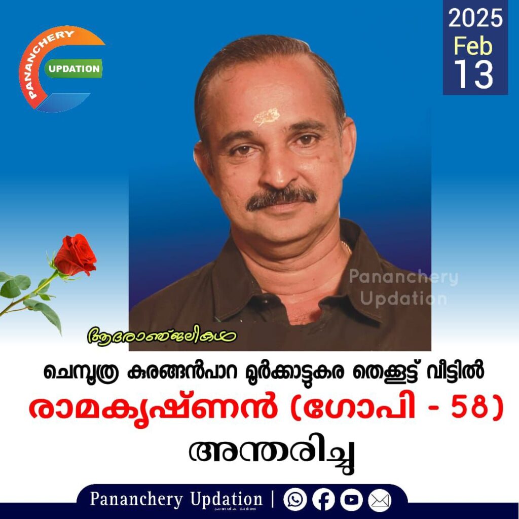 ചെമ്പൂത്ര കുരങ്ങൻപാറ മൂർക്കാട്ടുകര തെക്കൂട്ട് വീട്ടിൽ രാമകൃഷ്ണൻ (ഗോപി – 58) അന്തരിച്ചു