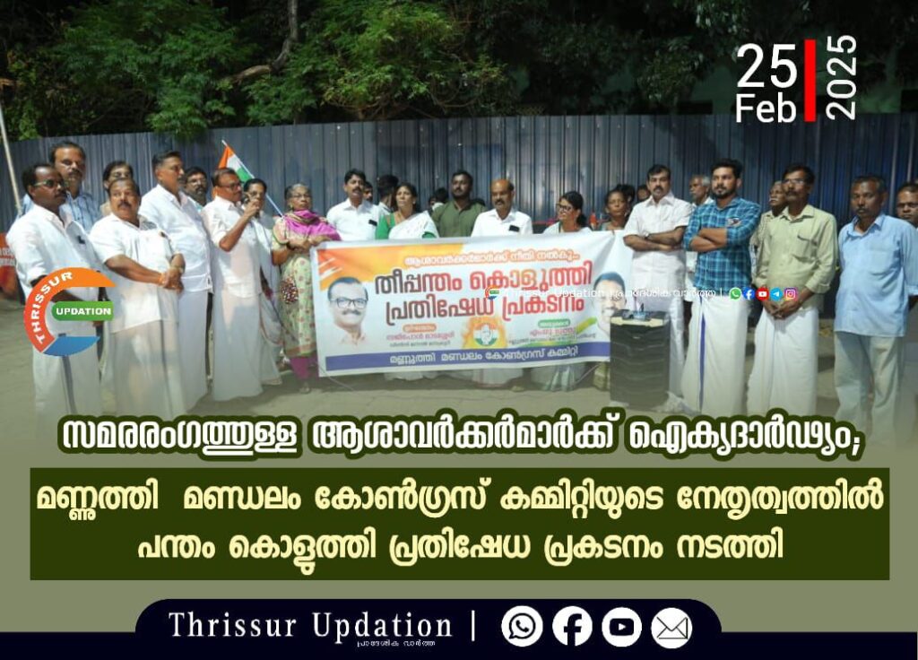 സമരരംഗത്തുള്ള ആശാവര്ക്കര്മാര്ക്ക് ഐക്യദാര്ഢ്യം പ്രഖ്യാപിച്ചും അവരോടുള്ള സംസ്ഥാന സര്ക്കാരിന്റെ അവഗണനയില് പ്രതിഷേധിച്ചും ആശാവര്ക്കര്മാര്ക്ക് നീതി നല്കൂ എന്ന മുദ്രാവാക്യം ഉയര്ത്തി കെ. പി. സി. സി. യുടെ ആഹ്വാന പ്രകാരം മണ്ണുത്തി മണ്ഡലം കോണ്ഗ്രസ് കമ്മിറ്റിയുടെ നേതൃത്വത്തില് പന്തം കൊളുത്തി പ്രതിഷേധ പ്രകടനം നടത്തി. മണ്ഡലം കോൺഗ്രസ് പ്രസിഡൻ്റ് എം യു മുത്തു അധ്യക്ഷതവഹിച്ച ചടങ്ങിൽ ഡിസിസി ജനറൽ സെക്രട്ടറി സജി പോൾ മാടശ്ശേരി ഉദ്ഘാടനം നിർവഹിച്ചു കോൺഗ്രസ് നേതാക്കളായ എ വി സുദർശൻ, എം ജി രാജൻ, എൻഎസ് നൗഷാദ് മാസ്റ്റർ, ബേബി പാലോലിക്കൽ, ബാവ ആർ എ, ലിസി ജോൺസൺ, ടിറ്റോ തോമസ്, സുമേഷ് സി വി തുടങ്ങിയവർ നേതൃത്വം നൽകി