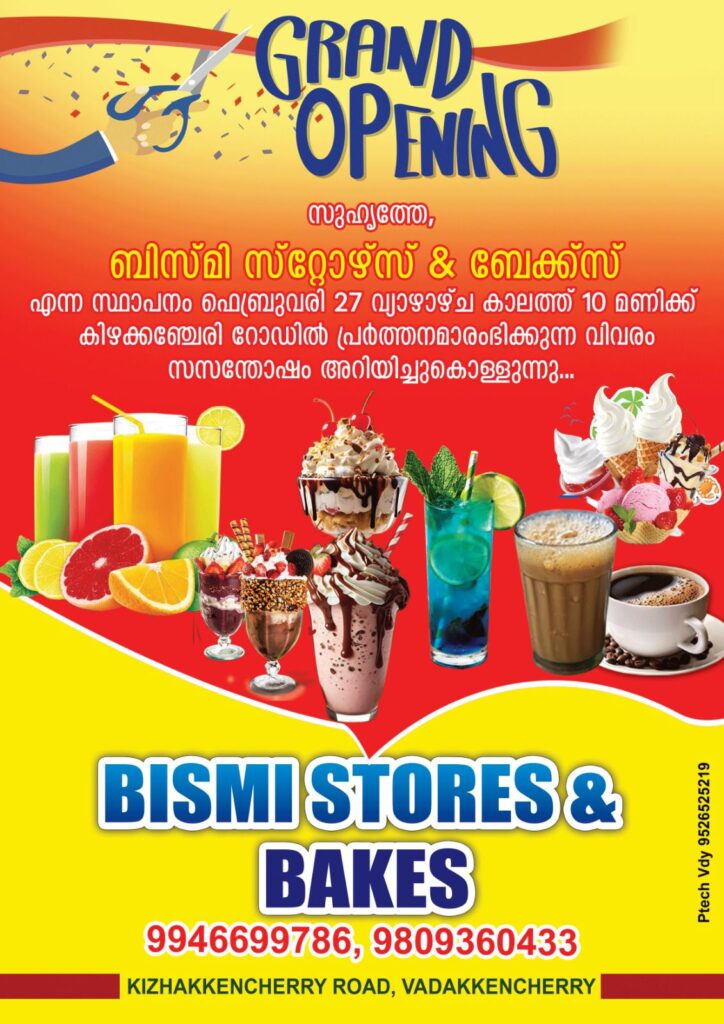 ബിസ്മി സ്റ്റോഴ്സ് & ബേക്ക്സ് എന്ന സ്ഥാപനം ഫെബ്രുവരി 27 വ്യാഴാഴ്ച കാലത്ത് 10 മണിക്ക് കിഴക്കഞ്ചേരി റോഡിൽ പ്രർത്തനമാരംഭിക്കുന്നു.