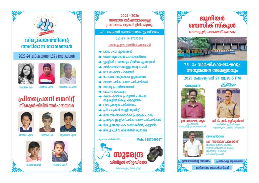 ജൂനിയർ ബേസിക് സ്കൂൾ വെമ്പല്ലൂർ 73-ാം വാർഷിവാർഷികാഘോഷവും അനുമോദന സമ്മേളനവും ഫെബ്രുവരി 27 ന് നടത്തുന്നു.ടി. എൻ. ഉണ്ണികൃഷ്ണൻ(സർക്കിൾ ഇൻസ്പെക്ടർ