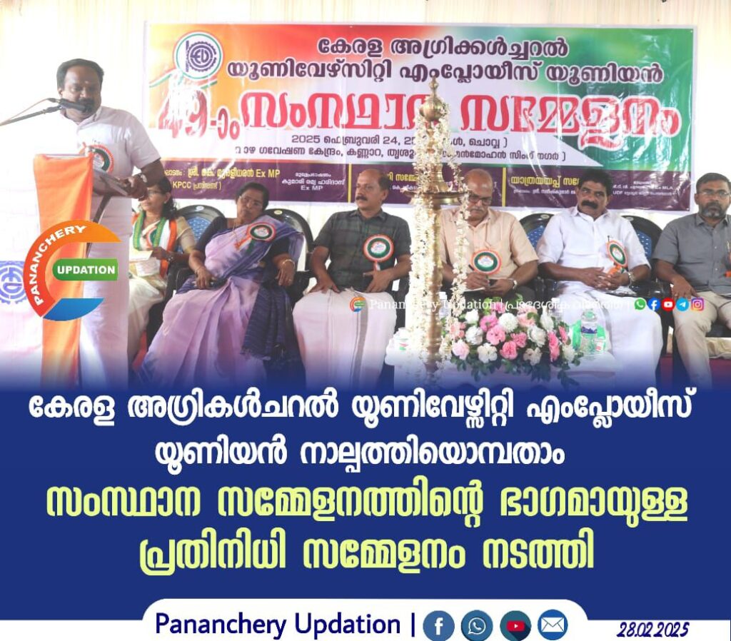 തൃശ്ശൂർ കണ്ണാറ വാഴ ഗവേഷണ കേന്ദ്രത്തിൽ നടന്ന കേരള അഗ്രികൾചറൽ യൂണിവേഴ്സിറ്റി എംപ്ലോയീസ് യൂണിയൻ നാല്പത്തിയൊമ്പതാം സംസ്ഥാന സമ്മേളനത്തിന്റെ ഭാഗമായുള്ള പ്രതിനിധി സമ്മേളനം ഡിസിസി എക്സിക്യൂട്ടീവ് മെമ്പർ കെ സി അഭിലാഷ് ഉദ്ഘാടനം ചെയ്തു.