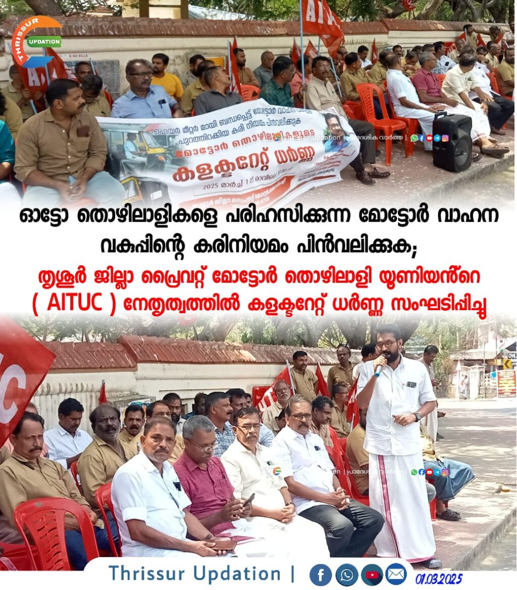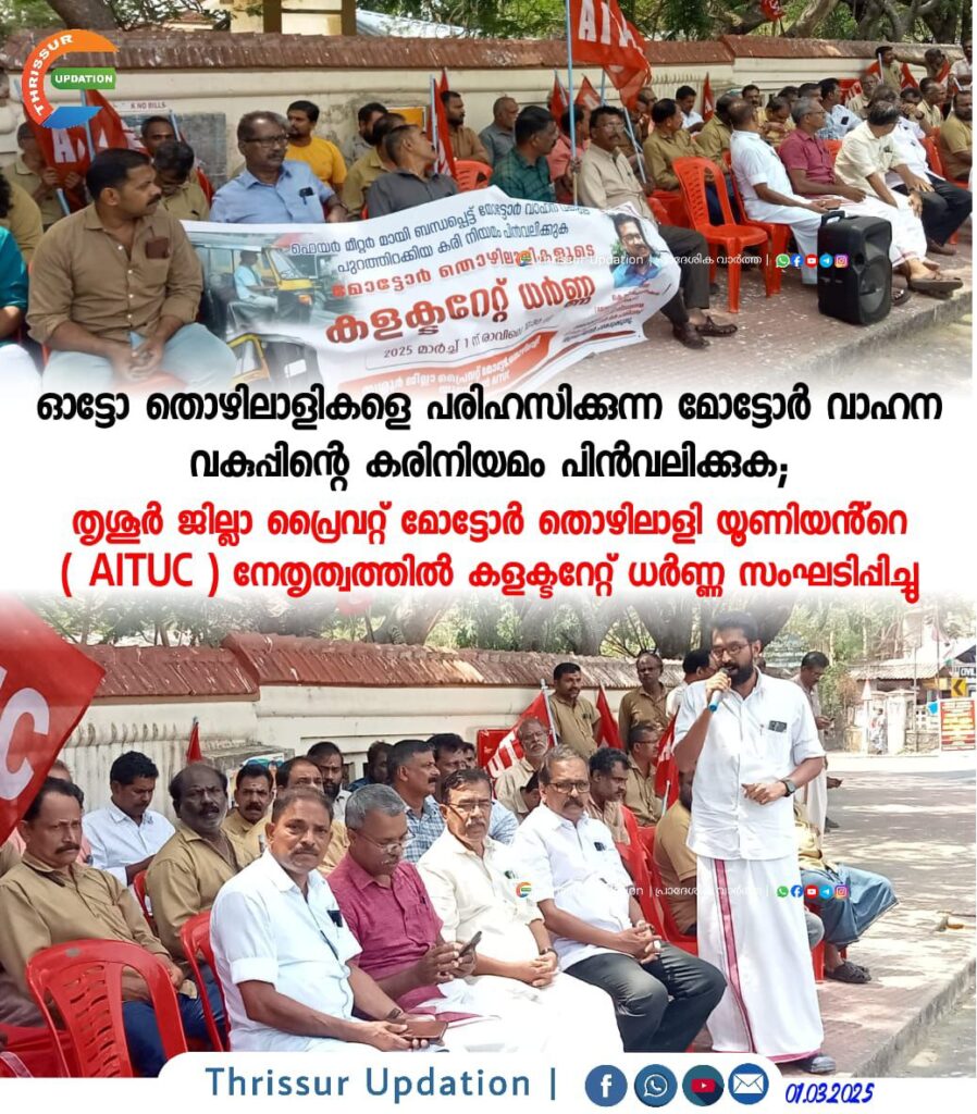 ഓട്ടോ തൊഴിലാളികളെ പരിഹസിക്കുന്ന മോട്ടോർ വാഹന വകുപ്പിന്റെ കരിനിയമം പിൻവലിക്കുക; തൃശൂർ ജില്ലാ പ്രൈവറ്റ് മോട്ടോർ തൊഴിലാളി യൂണിയൻ്റെ ( AITUC ) നേതൃത്വത്തിൽ കളക്ടറേറ്റ് ധർണ്ണ സംഘടിപ്പിച്ചു