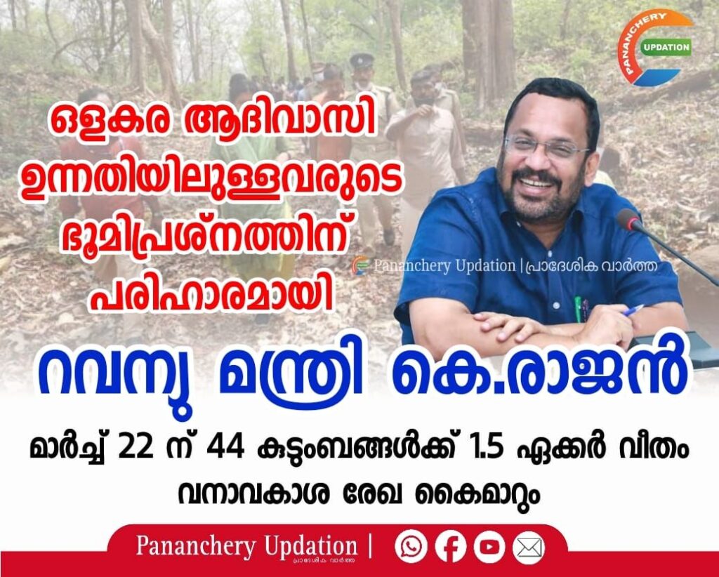 ഒളകര ആദിവാസി ഉന്നതിയിലുള്ളവരുടെ ഭൂമിപ്രശ്നത്തിന് പരിഹാരമായി ; റവന്യു മന്ത്രി കെ.രാജൻ മാർച്ച് 22 ന് 44 കുടുംബങ്ങള്ക്ക് 1.5 ഏക്കര് വീതം വനാവകാശ രേഖ കൈമാറും