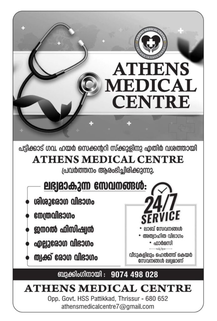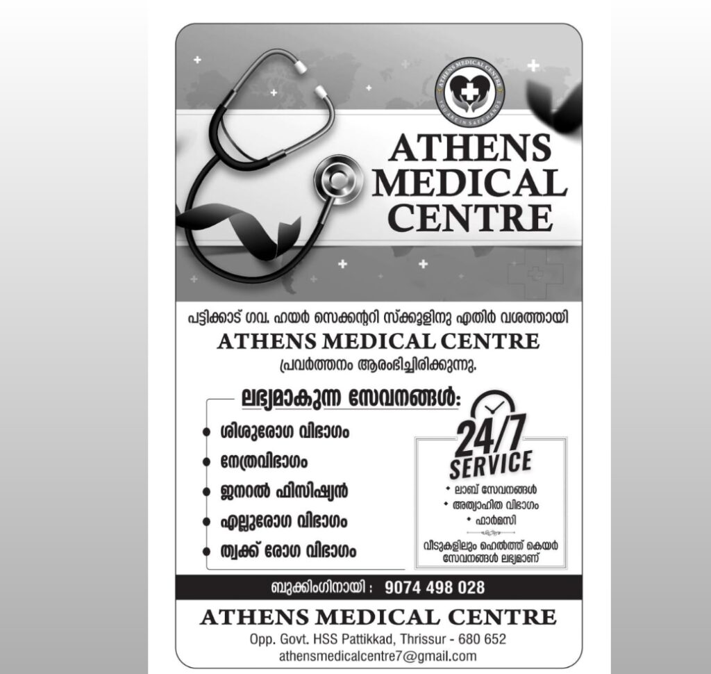 പട്ടിക്കാട് ഗവ. ഹയർ സെക്കൻ്ററി സ്ക്കൂളിനു എതിർ വശത്തായി ATHENS MEDICAL CENTRE പ്രവർത്തനം ആരംഭിച്ചിരിക്കുന്നു.