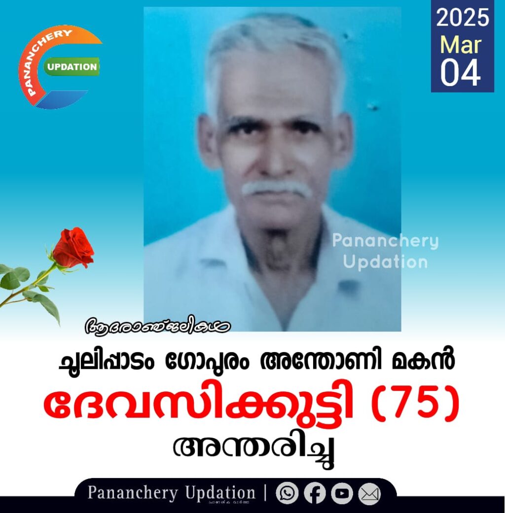 ചൂലിപ്പാടം ഗോപുരം അന്തോണി മകൻ ദേവസിക്കുട്ടി (75) അന്തരിച്ചു. സംസ്കാരം ഇന്ന് (04.03.2025- ചൊവ്വാഴ്ച) ഉച്ചകഴിഞ്ഞ് 3 മണിക്ക് ചുവന്നമണ്ണ് നിർമ്മലഗിരി സെൻ്റ് ജോസഫ് പള്ളിയിൽ. മക്കൾ: എബിൻ ഗോപുരം (എൻസിപി പാണഞ്ചേരി മണ്ഡലം പ്രസിഡന്റ്), സോബിൻ. മരുമക്കൾ: ലിനി , എൽബി.