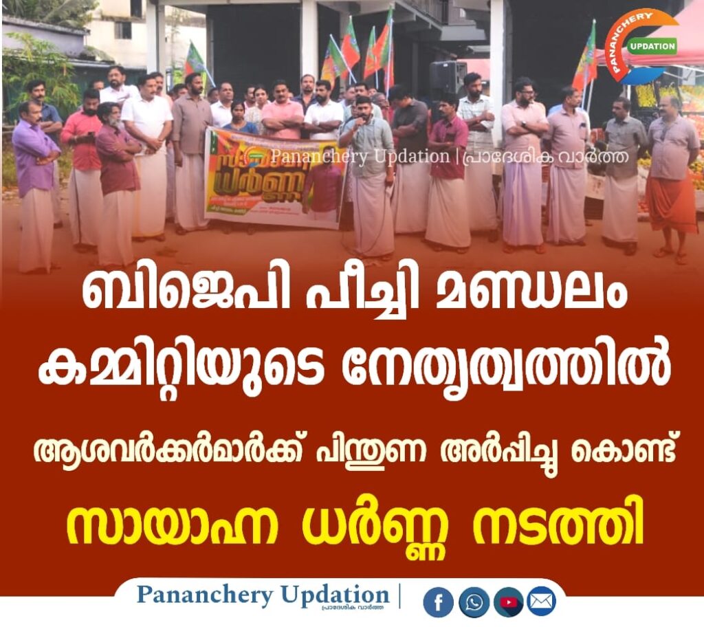 23 ദിവസമായി സെക്രട്ടറിയറ്റ് പടിക്കൽ സമരം നടത്തുന്ന ആശവർക്കർമാർക്ക് പിന്തുണ അർപ്പിച്ചു കൊണ്ട് ബിജെപി പീച്ചി മണ്ഡലം കമ്മിറ്റി സായാഹ്നം ധർണ്ണ നടത്തി. മണ്ഡലം പ്രസിഡന്റ് അധ്യക്ഷത വഹിച്ചു. ജില്ല ജനറൽ സെക്രട്ടറി ഹരി മുഖ്യപ്രഭാഷണം നടത്തി. ശിവരാജ് സ്വാഗതം പറഞ്ഞ ചടങ്ങിൽ അരുൺ നന്ദി പറഞ്ഞു. ധർണക്കു മുൻപു പീച്ചി റോഡിൽ നിന്നും ആരംഭിച്ച പ്രകടനത്തിൽ പ്രശാന്ത് ,ശിവരാജ് , ജോണി , സുന്ദർ, രാജൻ മാസ്റ്റർ, സന്തോഷ് കാക്കനാടൻ, ശിവൻ വാണിയമ്പാറ ,പ്രനീഷ് തുടങ്ങിയവർ നേതൃത്വം നൽകി.