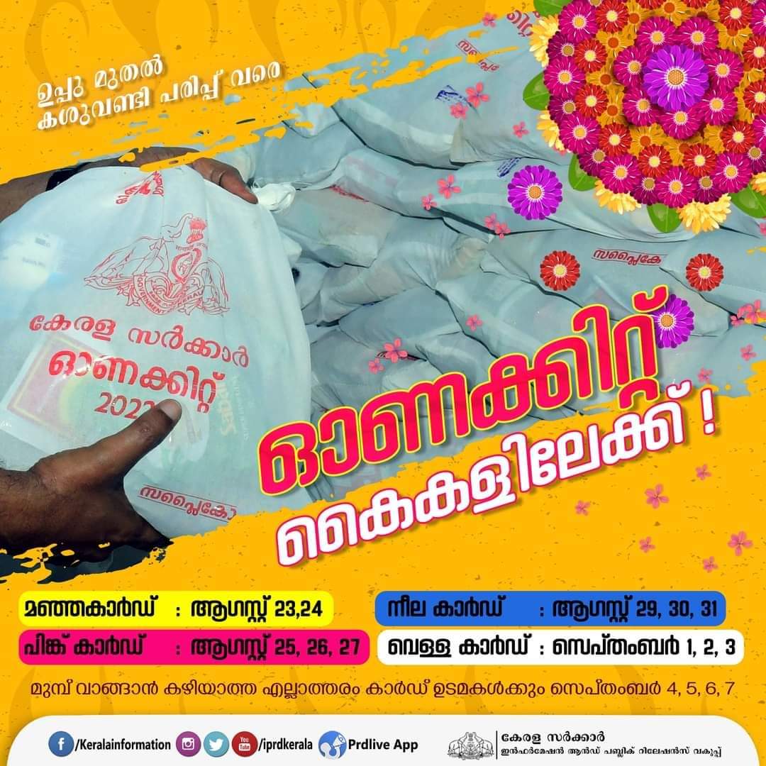 ആഗസ്റ്റ് 23, 24 തീയതികളിൽ എ.എ.വൈ (മഞ്ഞ കാർഡ്) കാർഡ് ഉടമകൾക്കും 25, 26, 27 തീയതികളിൽ പി.എച്ച്.എച്ച് (പിങ്ക്) കാർഡുകാർക്കും 29, 30, 31 തീയതികളിൽ എൻ.പി.എസ് (നീല) കാർഡുകാർക്കും സെപ്റ്റംബർ 1, 2, 3 തീയ്യതികളിൽ എൻ.പി.എൻ.എസ് (വെള്ള) കാർഡുടമകൾക്കും റേഷൻ കടകളിൽ നിന്ന് കിറ്റ് വാങ്ങാം.