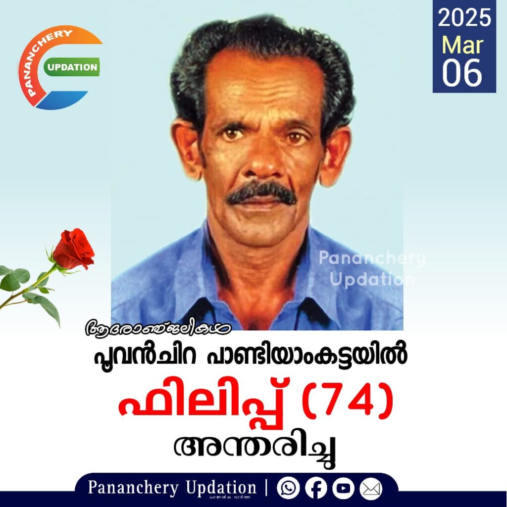 പൂവൻചിറ പാണ്ടിയാംകട്ടയിൽ മത്തായി മകൻ ഫിലിപ്പ് (74) അന്തരിച്ചു. സംസ്കാരം നാളെ (07.03.2025-വെള്ളിയാഴ്ച) ഉച്ചകഴിഞ്ഞ് 3 മണിക്ക് ചുവന്നമണ്ണ് സെന്റ് ജോർജ്ജ് ഓർത്തഡോക്സ് പള്ളിയിൽ. മക്കൾ: ബെന്നി, ബെൻസി. മരുമക്കൾ: ദീപ്തി, ബജിൻ.