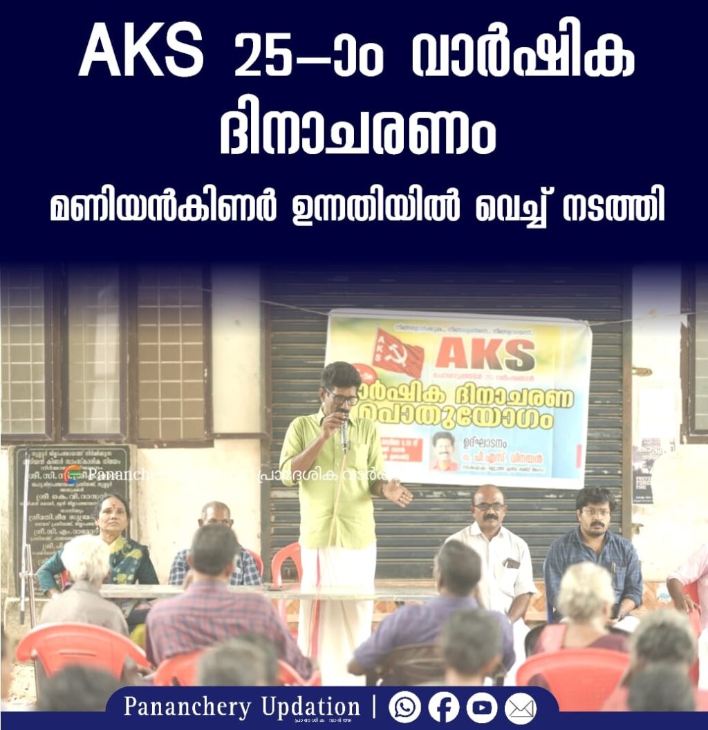 മണിയൻകിണർ ഉന്നതിയിൽ വെച്ച് നടന്ന. എ.കെ.എസ് ൻ്റെ 25-ാം വാർഷിക ദിനാചരണ പൊതുയോഗം. CPIM. മണ്ണുത്തി ഏരിയ കമ്മിറ്റി അംഗവും തൃശ്ശൂർ ജില്ലാ പഞ്ചായത്ത് മെമ്പർ കൂടി ആയ. പി. സ്. വിനയൻ ഉദ്ഘാടനം ചെയിതു. പരുപാടിയിൽ എ.കെ.എസ് ജില്ലാ പ്രസിഡന്റ് എം. എ. വിജയലക്ഷ്മി. അധ്യക്ഷത വഹിച്ചു. എ.കെ.എസ് ജില്ലാ കമ്മിറ്റി അംഗം. ബിജു വർഗീസ് സ്വാഗതം. പറഞ്ഞു. CPIM പാണഞ്ചേരി ലോക്കൽ കമ്മിറ്റി സെക്രട്ടറി. മനു പുതിയമടം. CPIM മണ്ണുത്തി ഏരിയ കമ്മിറ്റി അംഗം മാത്യു നൈനാൻ, എ.കെ.എസ് ജില്ല ജില്ലാ സെക്രട്ടറി. എം എ. കൃഷ്ണൻ, CPIM.മണിയൻകിണർ ബ്രാഞ്ച് സെക്രട്ടറി ശിവ പ്രസാദ് എന്നിവർ അഭിവാദ്യം ചെയ്തു സംസാരിച്ചു. എ.കെ.എസ് ജില്ലാ കമ്മിറ്റി അംഗം. എം. എ വിജയൻ നന്ദി പറഞ്ഞു.