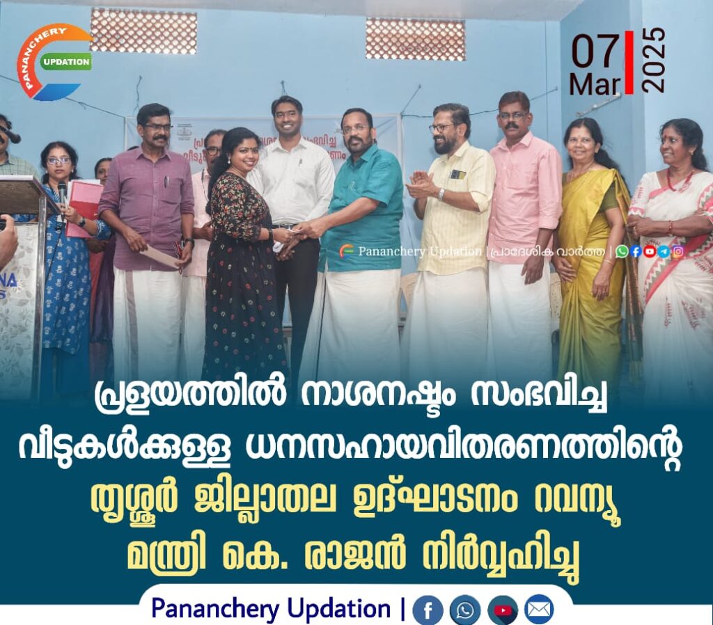 പ്രളയത്തില് നാശനഷ്ടം സംഭവിച്ച വീടുകള്ക്കുള്ള ധനസഹായവിതരണത്തിന്റെ തൃശ്ശൂർ ജില്ലാതല ഉദ്ഘാടനം റവന്യൂ മന്ത്രി കെ. രാജന് നിര്വ്വഹിച്ചു