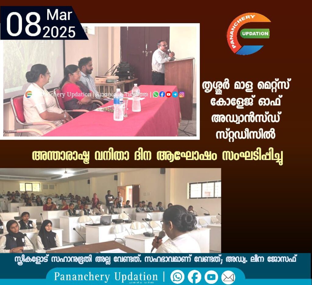 ഇന്ത്യയിലെ നിയമവ്യവസ്ഥ സ്ത്രീകൾക്ക് വളരെയധികം പരിരക്ഷ നൽകുന്നുണ്ട്. ഗാർഹിക പീഡന നിയമം സ്ത്രീകൾക്ക് വേണ്ടി മാത്രം ഉണ്ടാക്കിയിട്ടുള്ളതാണ്. സ്ത്രീകളെ ചൂഷണം ചെയ്യുന്നത് ഈ നിയമം ശക്തമായി നടപ്പിലാക്കി തുടങ്ങിയതോടെ ഒരു പരിധിവരെ കുറഞ്ഞിട്ടുണ്ട്. സ്ത്രീയും പുരുഷനും തമ്മിലുള്ള സന്തോഷകരമായ സഹവർത്തിത്വമാണ് കുടുംബ ജീവിതവിജയത്തിന് ആധാരം ; അഡ്വ. ലീന ജോസഫ്. തൃശ്ശൂർ മാള മെറ്റ്സ് കോളേജ് ഓഫ് അഡ്വാൻസ്ഡ് സ്റ്റഡീസിൽ അന്താരാഷ്ട്ര വനിതാ ദിന ആഘോഷം ഉദ്ഘാടനം ചെയ്തുകൊണ്ട് സംസാരിക്കുകയായിരുന്നു ഇരിങ്ങാലക്കുട ഫാമിലി കൗൺസിലിംഗ് സെൻറർ, ലീഗൽ കൗൺസിലറായ അഡ്വ. ലീന ജോസഫ്. മെറ്റ്സ് കോളേജ് ഓഫ് അഡ്വാൻസ്ഡ് സ്റ്റഡീസിലെ വുമൺ സെല്ലും സോഷ്യൽ ക്ലബ്ബും എൻഎസ്എസും സംയുക്തമായാണ് അന്താരാഷ്ട്ര വനിതാദിനം ആഘോഷിച്ചത്. ഗായത്രി ടി.ജെയുടെ പ്രാർത്ഥനയോടെ തുടങ്ങിയ ചടങ്ങിൽ മെറ്റ്സ് കോളേജ് ഓഫ് അഡ്വാൻസ്ഡ് സ്റ്റഡീസ് പ്രിൻസിപ്പാൾ ഡോ. ഫോൺസി ഫ്രാൻസിസ് സ്വാഗതം പറഞ്ഞു. മെറ്റ്സ് ഗ്രൂപ്പ് ഓഫ് ഇൻസ്റ്റിറ്റ്യൂഷൻസ് അക്കാദമിക് ഡയറക്ടർ ഡോ. എ. സുരേന്ദ്രൻ അധ്യക്ഷത വഹിച്ചു. മെറ്റ്സ് കോളേജ് ഓഫ് അഡ്വാൻസ്ഡ് സ്റ്റഡീസ് എൻഎസ്എസ് പ്രോഗ്രാം ഓഫീസർ പ്രൊഫ. ജസ്റ്റിൻ ജോസഫ് ചടങ്ങിന് ആശംസകളും വുമൺ സെൽ കോർഡിനേറ്റർ പ്രൊഫ. പ്രിയ എ.പി. നന്ദിയും പ്രകാശിപ്പിച്ചു. കോളേജിലെ വിദ്യാർത്ഥിനികളും ഫാർമസി കോളേജിലെ വിദ്യാർത്ഥിനികളും പ്രോഗ്രാമിൽ പങ്കെടുക്കുകയും വിശിഷ്ടാതിഥിയുമായി സ്ത്രീ സുരക്ഷയ്ക്കുള്ള നിയമപരമായ കാര്യങ്ങളെക്കുറിച്ച് സംശയ നിവാരണം നടത്തുകയും ചെയ്തു.