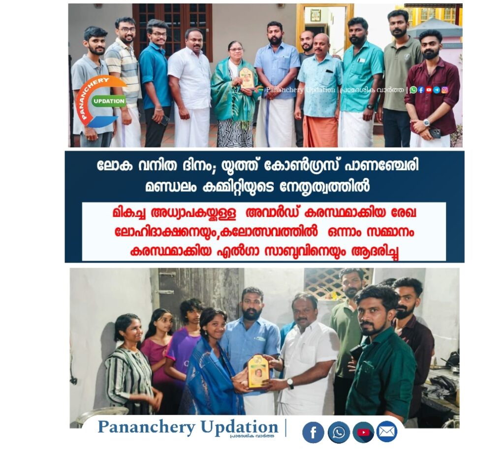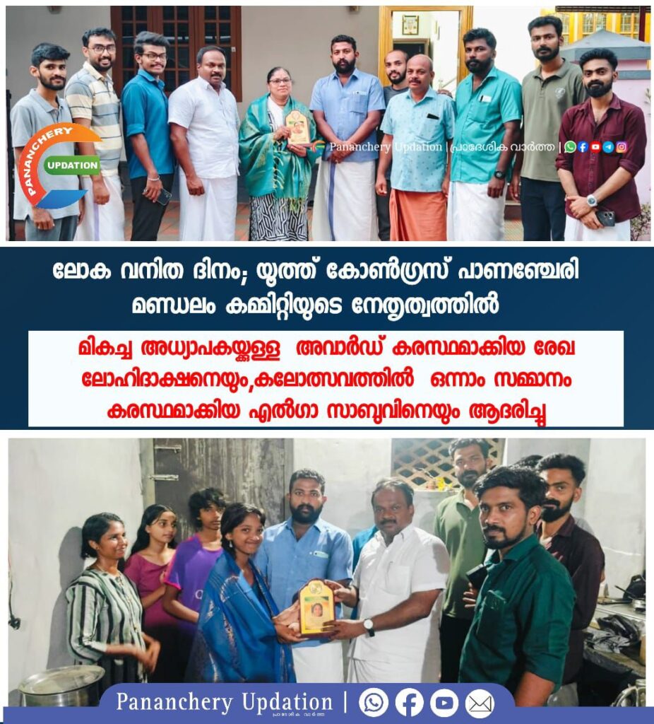 ലോക വനിത ദിനത്തിന്റെ ഭാഗമായി യൂത്ത് കോൺഗ്രസ് പാണഞ്ചേരി മണ്ഡലം കമ്മിറ്റിയുടെ നേതൃത്വത്തിൽ സംസ്ഥാന സർക്കാരിന്റെ മികച്ച അധ്യാപകയ്ക്കുള്ള അവാർഡ് കരസ്ഥമാക്കിയ ടീച്ചർ രേഖ ലോഹിദാക്ഷനെയും, തൃശ്ശൂർ ഈസ്റ്റ് ഉപജില്ല സംസ്കൃത കലോത്സവത്തിൽ ഗാനാലാപനത്തിൽ ഒന്നാം സമ്മാനം കരസ്ഥമാക്കിയ എൽഗാ സാബുവിനെയും പൊന്നാട ചാർത്തി മൊമന്റോ നൽകി ആദരിച്ചു. യൂത്ത് കോൺഗ്രസ് മണ്ഡലം പ്രസിഡണ്ട് ജിഫിൻ ജോയി അധ്യക്ഷത വഹിച്ചു. ഡിസിസി എക്സിക്യൂട്ടീവ് മെമ്പർ കെ സി അഭിലാഷ് ഉദ്ഘാടനം ചെയ്തു.