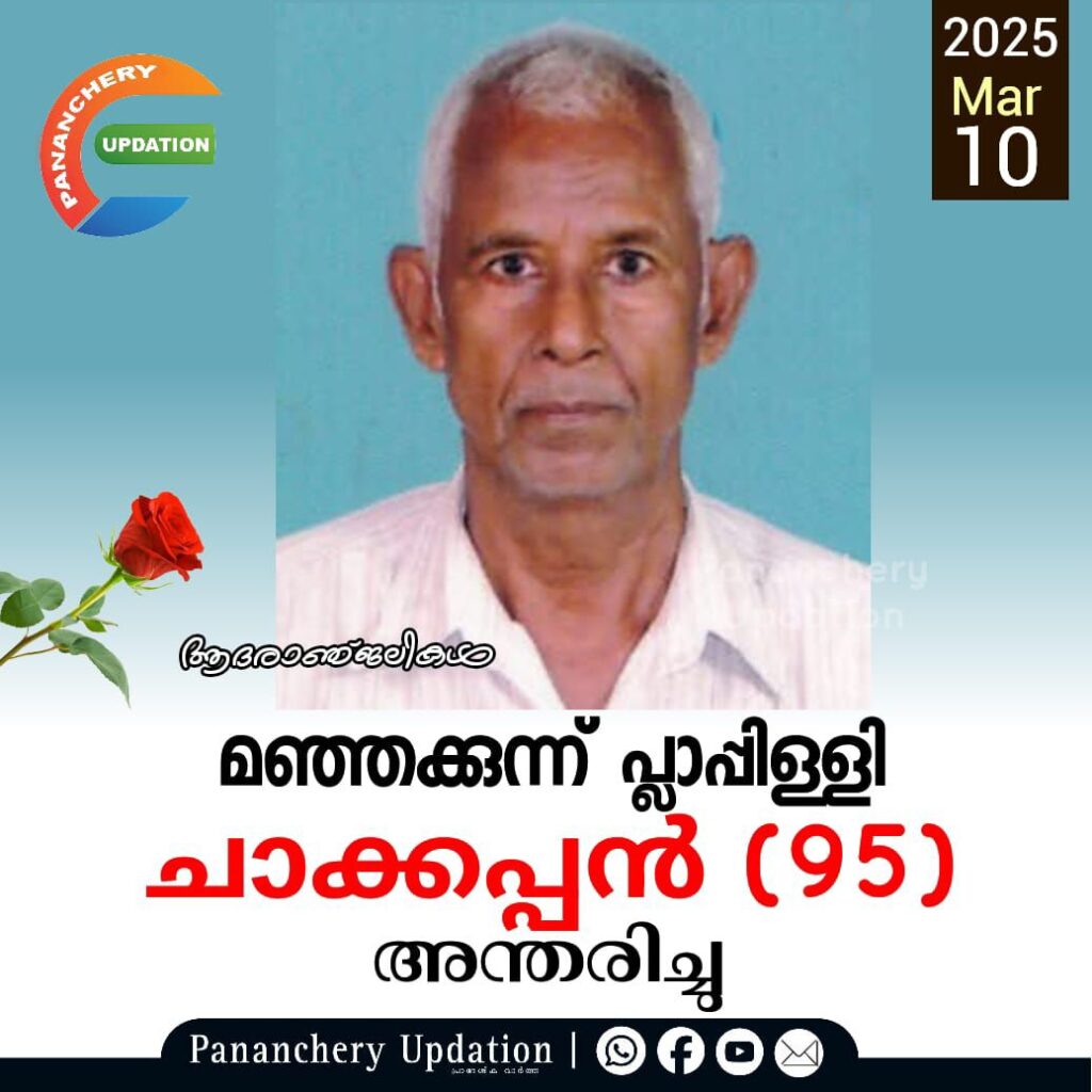 മഞ്ഞക്കുന്ന് പ്ലാപ്പിള്ളി ചാക്കപ്പൻ (95) അന്തരിച്ചു. സംസ്കാരം ഇന്ന്(10.03.2025-തിങ്കളാഴ്ച) ഉച്ചകഴിഞ്ഞ് മൂന്നുമണിക്ക് ഭവനത്തിൽ ശുശ്രൂഷ ആരംഭിച്ച് തുടർന്ന് കരിപ്പക്കുന്ന് മാർ ബസേലിയോസ് ഓർത്തഡോക്സ് പള്ളിയിൽ. ഭാര്യ: പരേതയായ അന്നക്കുട്ടി. മക്കൾ: ജോർജ്, വർഗീസ്, മേരി, പൗലോസ്, മോളി. മരുമക്കൾ: മേഴ്സി, സോളി, ഐസക്ക്, മിനി, തങ്കച്ചൻ.