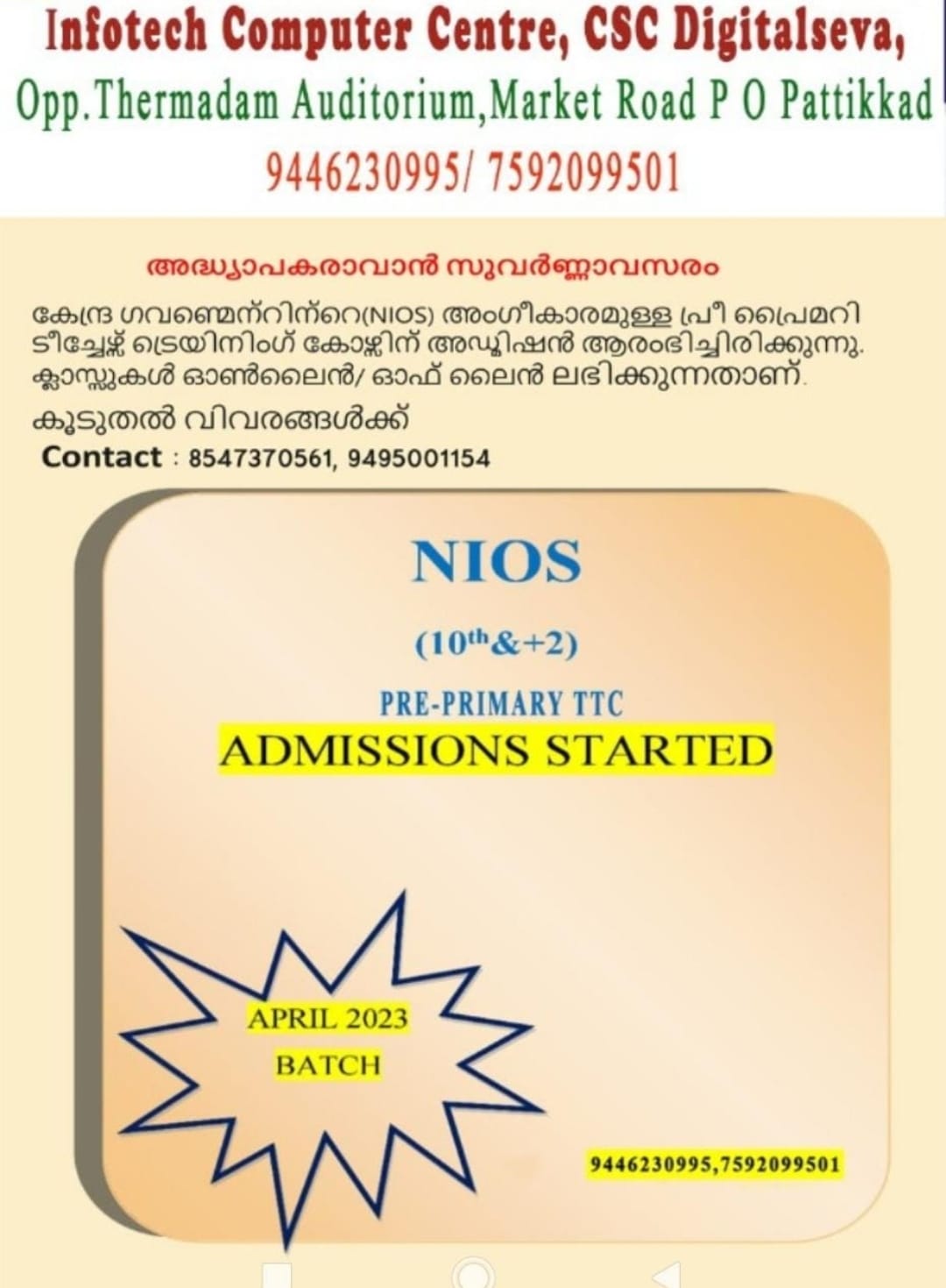 ഇൻഫോടെക് കമ്പ്യൂട്ടർ സെന്റർ പട്ടിക്കാട് www.infotechcomputercenter.co.in അദ്ധ്യാപകരാവാൻ സുവർണ്ണാവസരം കേന്ദ്ര ഗവൺമെന്റിന്റെ (NIOS) അംഗീകാരമുള്ള പ്രീ പ്രൈമറി ടീച്ചേഴ്സ് ട്രൈയിനിംഗ് കോഴ്സിന് അഡ്മിഷൻ ആരംഭിച്ചിരിക്കുന്നു. കൂടുതൽ വിവരങ്ങൾക്ക് വിളിക്കുക. 94462 30995 7592099501 9495001154