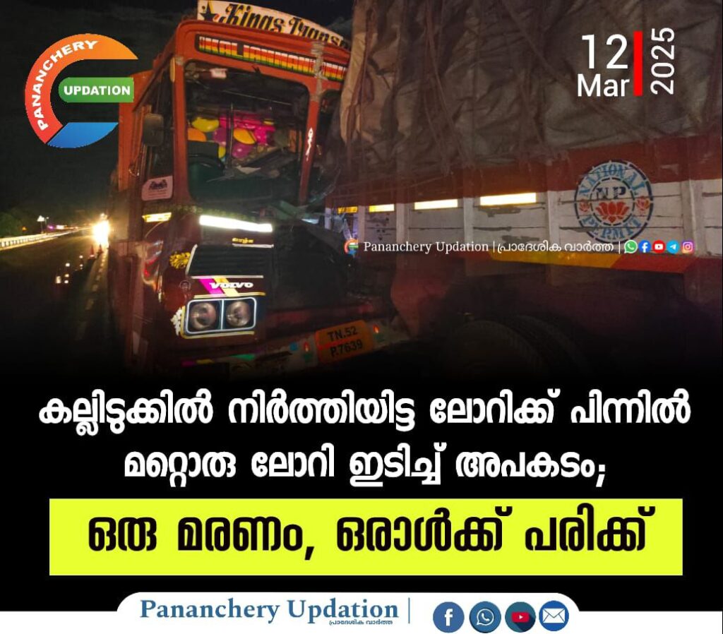 കല്ലിടുക്കിൽ നിർത്തിയിട്ട ലോറിക്ക് പിന്നിൽ മറ്റൊരു ലോറി ഇടിച്ച് അപകടം; ഒരാൾ മരിച്ചു. ഒരാൾക്ക് പരിക്ക്