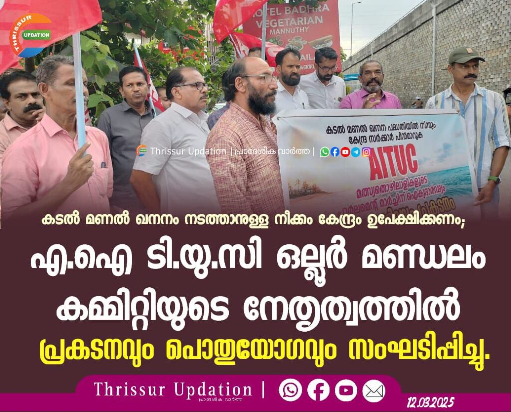കടൽ മണൽ ഖനനം നടത്താനുള്ള നീക്കം കേന്ദ്രം ഉപേക്ഷിക്കണം; എ.ഐ ടി.യു.സി ഒല്ലൂർ മണ്ഡലം കമ്മിറ്റിയുടെ നേതൃത്വത്തിൽ പ്രകടനവും പൊതുയോഗവും സംഘടിപ്പിച്ചു.