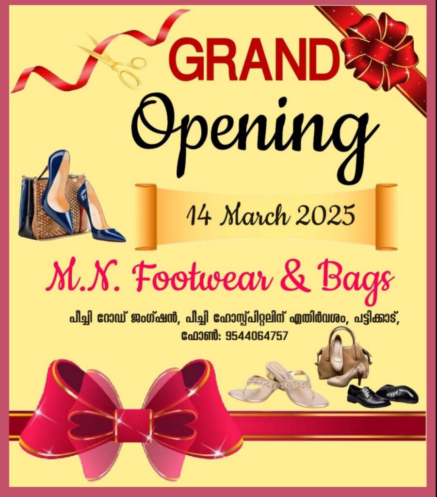 പീച്ചി റോഡ് ജംഗ്ഷനിൽ, പീച്ചി ഹോസ്പിറ്റലിന് എതിർവശം *എം.എൻ. ഫുട്ട് വെയർ & ബാഗ്സ്* എന്ന സ്ഥാപനം നാളെ(14.03.2025-വെള്ളിയാഴ്ച) ഉദ്ഘാടനം ചെയ്ത് പ്രവർത്തനം ആരംഭിക്കുന്നു. എല്ലാവിധ ലേഡീസ് & ജെൻ്റ്സ് ചെരുപ്പുകളും, ഷൂസുകളും, കുട്ടികൾക്കാവശ്യമായ ചെരുപ്പുകളും മിതമായ നിരക്കിൽ ഇവിടെ ലഭിക്കുന്നതാണ്. നിങ്ങളേവരുടെയും സഹകരണം പ്രതീക്ഷിക്കുന്നു.