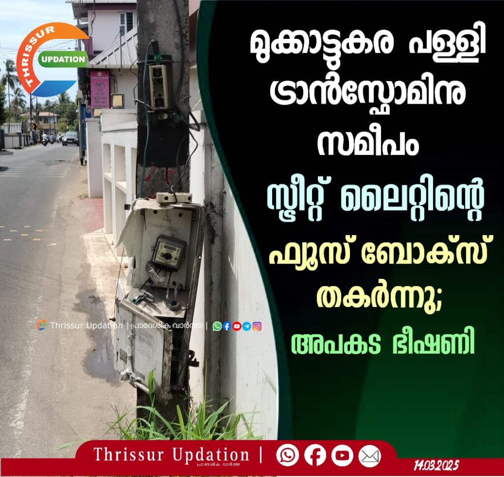 മുക്കാട്ടുകര പള്ളി ട്രാൻസ്ഫോമിനു സമീപം സ്ട്രീറ്റ് ലൈറ്റിൻ്റെ ഫ്യൂസ് ബോക്സ് തകർന്നു; അപകട ഭീഷണി