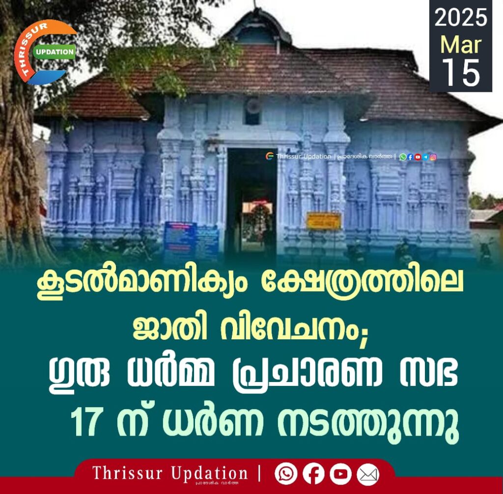 കൂടൽമാണിക്യം ക്ഷേത്രത്തിലെ ജാതി വിവേചനം; ഗുരു ധർമ്മ പ്രചാരണ സഭ 17 ന് ധർണ നടത്തുന്നു