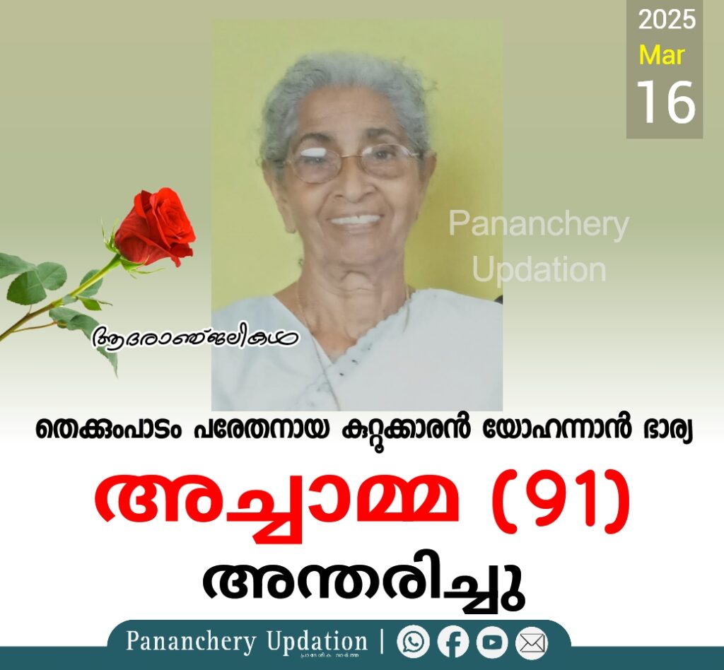 പട്ടിക്കാട് തെക്കുംപാടം പരേതനായ കുറ്റൂക്കാരൻ യോഹന്നാൻ ഭാര്യ അച്ചാമ്മ (91) അന്തരിച്ചു. സംസ്ക്കാരം നാളെ (17.03.2025) രാവിലെ 11.30 ന് ചുവന്നമണ്ണ് സെൻ്റ് തോമസ് മലങ്കര കാത്തലിക് ചർച്ചിൽ .മക്കൾ : ജോർജ്കുട്ടി(Late), ബേബി (Late), കുഞ്ഞുമോൻ , മത്തായി ,ജോസ് (Late)