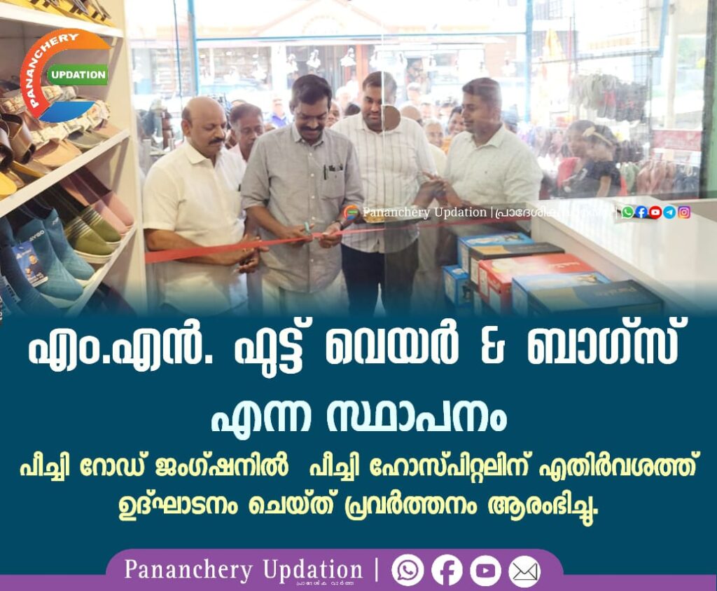 എം.എൻ. ഫുട്ട് വെയർ & ബാഗ്സ്* എന്ന സ്ഥാപനം പീച്ചി റോഡ് ജംഗ്ഷനിൽ പീച്ചി ഹോസ്പിറ്റലിന് എതിർവശത്ത് ഉദ്ഘാടനം ചെയ്ത് പ്രവർത്തനം ആരംഭിച്ചു. പാണഞ്ചേരി ഗ്രാമപഞ്ചായത്ത് പ്രസിഡൻറ് പി പി രവീന്ദ്രൻ ഉദ്ഘാടനം നിർവഹിച്ചു.വ്യാപാര വ്യവസായി പ്രസിഡൻറ് ബാബു കൊള്ളന്നൂർ, പൊതുപ്രവർത്തകർ, രാഷ്ട്രീയ പ്രമുഖർ നാട്ടുകാർ എന്നിവർ പരിപാടിയിൽ പങ്കെടുത്തു