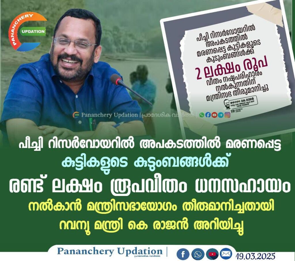 പീച്ചി റിസർവോയറിൽ അപകടത്തിൽ മരണപ്പെട്ട കുട്ടികളുടെ കുടുംബങ്ങൾക്ക് രണ്ട് ലക്ഷം രൂപവീതം ധനസഹായം നൽകും