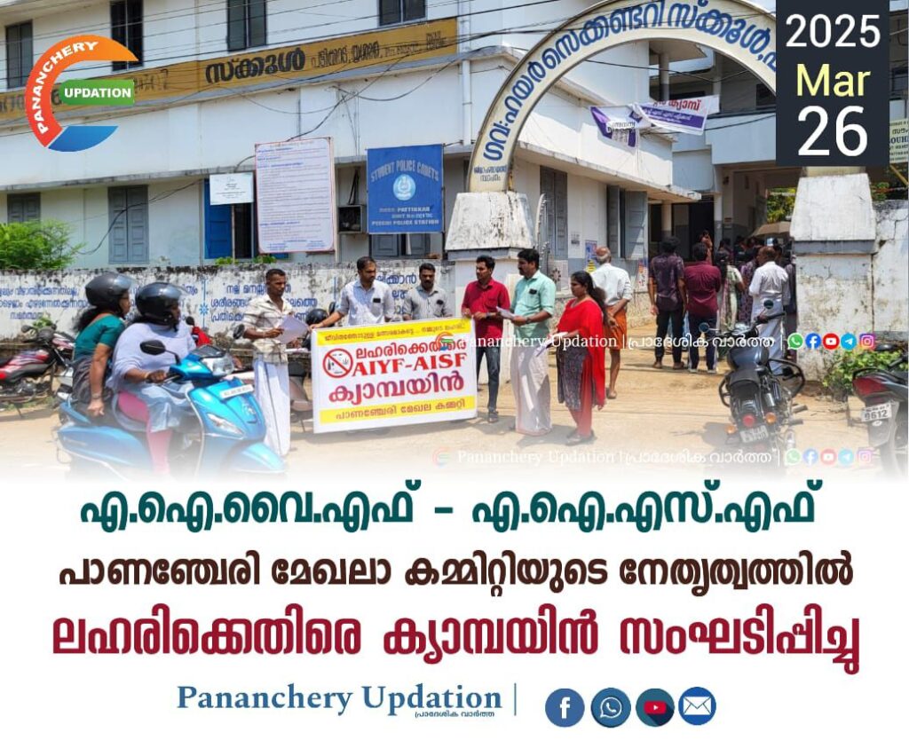 വിദ്യാർത്ഥികൾക്കിടയിൽ ഇടം പിടിക്കുന്ന ലഹരിവസ്തുകളുടെ ഉപയോഗത്തിനെതിരെ ബോധവൽക്കരണ ലഘുരേഖ വിതരണവുമായി AlYF – AISF പ്രവർത്തകർ SSLC പരീക്ഷ പൂർത്തിയാക്കി സ്കൂൾ അടയ്ക്കുന്ന ദിവസമായ ഇന്ന് വിദ്യാർത്ഥികൾക്കും രക്ഷിതാക്കൾക്കും അധ്യാപകർക്കും ലഹരിക്ക് എതിരായ ലഘുലേഖ വിതരണവും ബോധവൽക്കരണവും നടത്തി. ക്യാമ്പയിൻ സി പി ഐ ലോക്കൽ സെക്രട്ടറി സനിൽ വാണിയംപാറ ഉദ്ഘാടനം ചെയ്തു