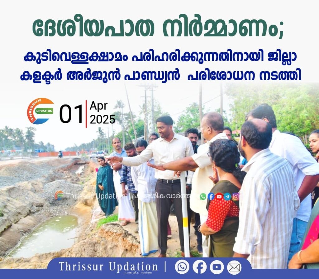 കൈപമംഗലം പഞ്ചായത്തിലെ കാളമുറിയിൽ ദേശീയപാത നിർമ്മാണത്തിനിടെ ശിവാലയ അധികൃതർ 300 മീറ്റർ നീളത്തിൽ തകർത്ത പൈപ്പുകൾ 2025 ഏപ്രിൽ 5 നകം പുതുതായി സ്ഥാപിച്ച് 200 എം എം എച്ച്ഡിപിഇ പൈപ്പുമായി ഇന്റർകണക്ട് ചെയ്തു കുടിവെള്ളവിതരണം പുന സ്ഥാപിച്ചു നൽകാമെന്നും ദേശീയപാത അധികൃതർ ഉറപ്പു നൽകി. ഇതിൻ്റെ പുരോഗതി വിലയിരുത്തി റിപ്പോർട്ട് നൽകുന്നതിനായി ഡെപ്യൂട്ടി കളക്ടറെ ചുമതലപ്പെടുത്തി. എസ്.എൻ പുരം, കൈപ്പമംഗലം പഞ്ചായത്ത് പ്രസിഡന്റുമാരും കേരള വാട്ടർ അതോറിറ്റി അധികൃതരും സ്ഥല സന്ദർശനത്തിന് ജില്ലാ കളക്ടറോടൊപ്പമുണ്ടായിരുന്നു.