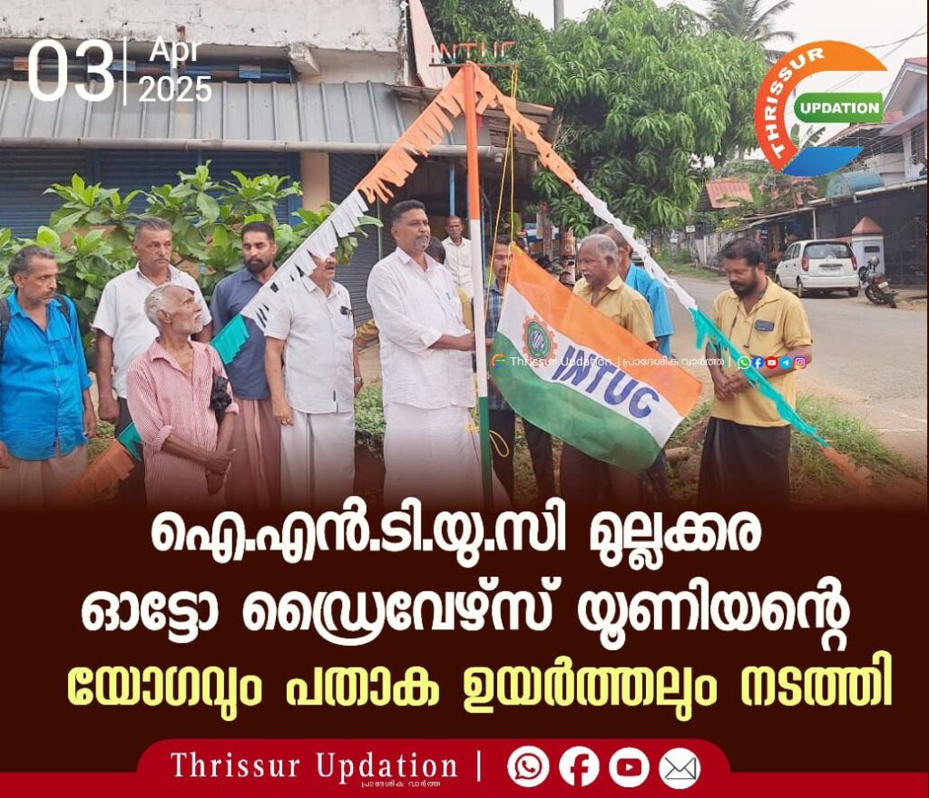 മുല്ലക്കര ഓട്ടോ ഡ്രൈവേഴ്സ് യൂണിയൻ ഐ. എൻ. ടി. യു. സി. യുടെ യോഗവും പതാക ഉയർത്തലും മുല്ലക്കര മുളയം റോഡ് ജംഗ്ഷനിൽ വെച്ച് നടന്നു. മണ്ഡലം കോൺഗ്രസ് പ്രസിഡന്റ് എം. യു.മുത്തു പതാക ഉയർത്തി ഉദ്ഘാടനം ചെയ്തു. യൂണിയൻ സെക്രട്ടറി പി. ആർ.ഫ്രാൻസിസ് അധ്യക്ഷത വഹിച്ചു മണ്ഡലം കോൺഗ്രസ് കമ്മിറ്റി വൈസ് പ്രസിഡൻ്റ് മാരായ ബേബി പാലോലിക്കൽ, ജോണി അരിമ്പൂർ, നേതാക്കളായ ഉണ്ണികൃഷ്ണൻ പനവളപ്പിൽ, പി. ഡി.ദേവസി, സിജോ ജോസ്, ശിവൻ,ഷാജു തുടങ്ങിയവർ നേതൃത്വം നൽകി