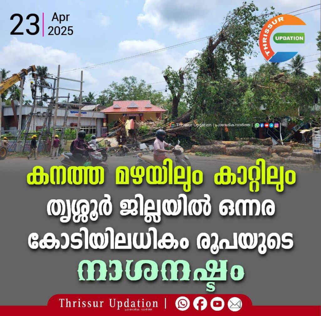തൃശ്ശൂർ ജില്ലയിൽ ചൊവ്വാഴ്ച വൈകീട്ട് പെയ്ത കനത്ത മഴയിലും കാറ്റിലും 1,66,77,000 രൂപയുടെ വ്യാപക നാശനഷ്ടം സംഭവിച്ചു. ശക്തമായ കാറ്റിലും കനത്ത മഴയെയും തുടർന്ന് നാശനഷ്ടങ്ങൾ സംഭവിച്ച തൃശ്ശൂർ പുല്ലഴിയിലെ വീടും, വൈദ്യുതി പോസ്റ്റുകൾ വീണ് നാശം സംഭവിച്ച ഒളരി കൊട്ടിൽ റോഡ് ഭാഗവും ജില്ലാ കളക്ടർ അർജുൻ പാണ്ഡ്യൻ സന്ദർശിച്ചു.