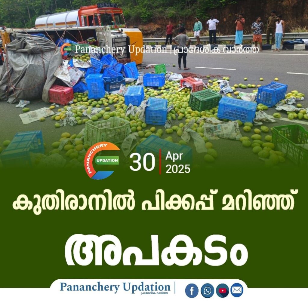 ദേശീയപാതയിൽ കുതിരാനിൽ മാങ്ങ കയറ്റി വന്ന പിക്കപ്പാണ് നിയന്ത്രണം വിട്ട് ഡിവൈഡറിൽ ഇടിച്ച് മറിഞ്ഞത്. പരിക്ക് പറ്റിയവരെ ഉടൻ തന്നെ ഹൈവേ എമർജൻസി ടീമിൻ്റെ ആംബുലൻസിൽ കയറ്റി ആശുപത്രിയിൽ കൊണ്ട് പോയി. ഡ്രൈവർക്ക് പരിക്കുകൾ ഉണ്ട് . കാലത്ത് പത്തേ കാലിനാണ് അപകടം നടന്നത്.ദേശീയപാതയിൽ മറിഞ്ഞ പിക്കപ്പും മാങ്ങയും നീക്കുന്നതിനുള്ള നടപടികൾ സ്വീകരിച്ച് വരുന്നു.കുതിരാൻ കഴിഞ്ഞ് വഴുക്കുംപാറ പാലത്തിന് മുകളിലാണ് അപകടം