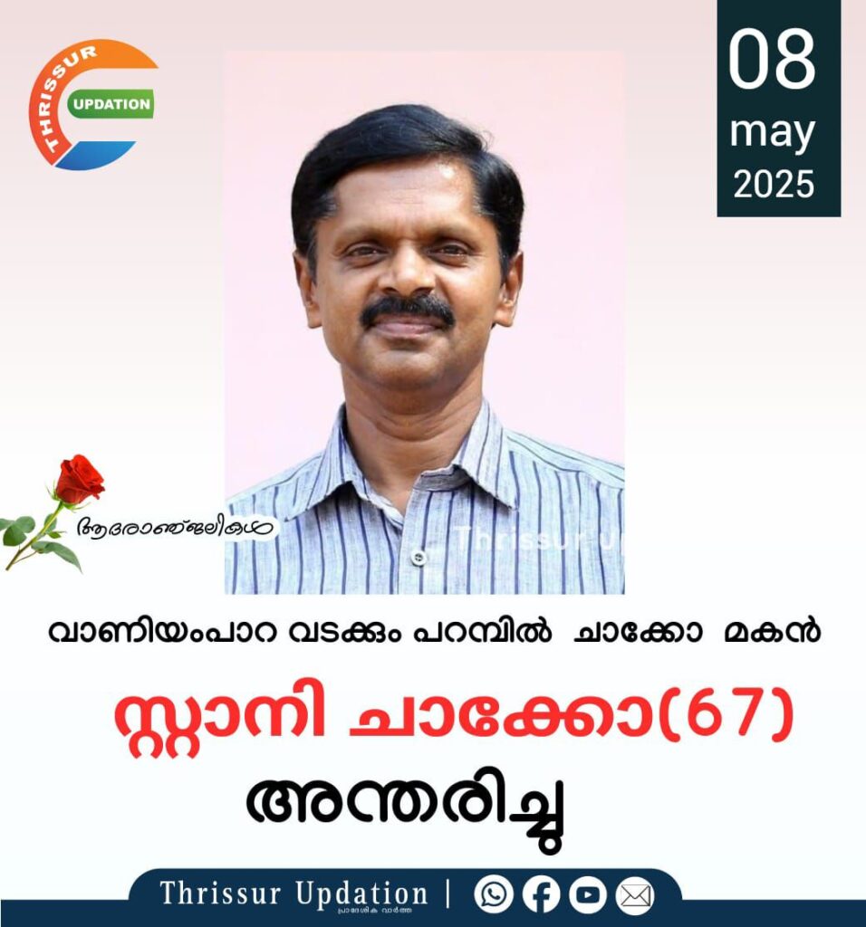 വാണിയംപാറ വടക്കും പറമ്പിൽ ചാക്കോ മകൻ സ്റ്റാനി ചാക്കോ (67) അന്തരിച്ചു.സംസ്കാരം ഇന്ന് (08.05.2025- വ്യാഴം) ഉച്ചയ്ക്കുശേഷം 3.30ന് പന്തലാംപാടം പള്ളിയിൽ. എയർഫോഴ്സ് സേവനത്തിനുശേഷം ഹെൽത്ത് ഇൻസ്പെക്ടർ ആയി സേവനം അനുഷ്ഠിച്ചിരുന്നു. ഇദ്ദേഹം ദീർഘ കാലം വാണിയംപാറ പ്രാഥമിക ആരോഗ്യകേന്ദ്രത്തിലും പ്രവർത്തിച്ചിരുന്നു. ഭാര്യ: പരേതയായ റാണി മക്കൾ: സരുൺ, ശാലു മരുമക്കൾ : സെബിൻ