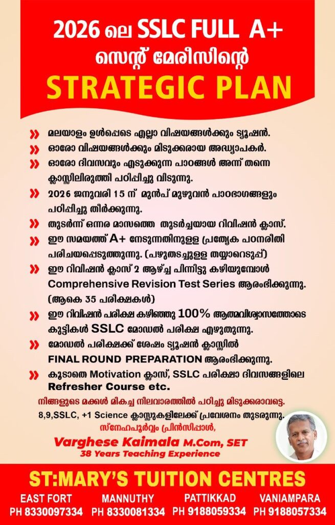 നിങ്ങളുടെ മക്കൾ മികച്ച നിലവാരത്തിൽ പഠിച്ചു മിടുക്കരാവട്ടെ. 8,9,SSLC, +1 Science ക്ലാസ്സുകളിലേക്ക് പ്രവേശനം തുടരുന്നു.