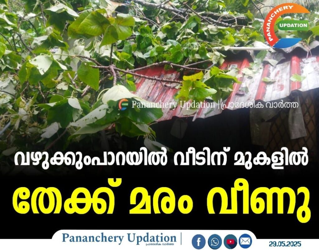 ജെയ്സൺ ആന്റണി എന്ന വ്യക്തിയുടെ വീട്ടിലേക്കാണ് ഇന്നലെ രാത്രി 8 മണിക്ക് ഉണ്ടായ കാറ്റിലും മഴയിലും വന ഭൂമിയിൽ നിന്ന് തേക്ക് മരം കടപ്പുഴകി വീണത്. വീട് ഭാഗികമായി തകർന്നു . മരം വീഴുന്ന സമയത്ത് വീട്ടിൽ ജെയ്സനും ഭാര്യയും രണ്ട് മക്കളും ഉണ്ടായിരുന്നു. തലനാരിഴക്കാണ് വലിയ അപകടം ഒഴിവായത് . തകർന്ന റൂമിലായിരുന്നു ജെയ്സൺ . പാണഞ്ചേരി പഞ്ചായത്തിലെ ആറാം വാർഡിലാണ് വീടിന് മുകളിലേക്ക് തേക്ക് മരം വീണത്. ഫോറസ്റ്റ് ഉദ്യോഗസ്ഥരും വാർഡ് മെമ്പർ ബിജോയ് ജോസും സംഭവ സ്ഥലത്ത് എത്തി. സമീപത്ത് അപകട ഭീഷിണിയിൽ ഇനിയും മരങ്ങൾ നിൽക്കുന്നുണ്ട്.