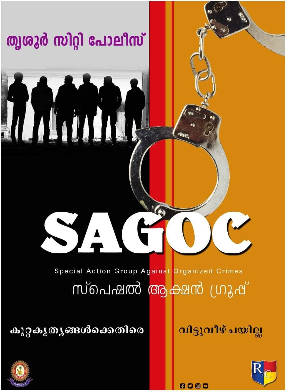 ആസൂത്രിത കുറ്റകൃത്യങ്ങൾ തടയുന്നതിനും കുറ്റവാളികളെ കണ്ടെത്തുന്നതിനും തൃശൂർ സിറ്റി പോലീസ് സ്പെഷൽ ആക്ഷൻ ഗ്രൂപ്പ് രൂപീകരിച്ചു. Special Action Group Against Organized Crimes – SAGOC എന്നാണ് ടീമിന് നൽകിയിട്ടുള്ള പേര്. വിവിധ പോലീസ് സ്റ്റേഷനുകളിൽ പ്രവർത്തിച്ച് കുറ്റാന്വേഷണ രംഗത്ത് മികവു തെളിയിച്ച പോലീസുദ്യോഗസ്ഥരെയാണ് ഇതിലേക്ക് തിരഞ്ഞെടുത്തിട്ടുള്ളത്. സ്പെഷൽ ബ്രാഞ്ച് അസിസ്റ്റന്റ് കമ്മീഷണർക്കാണ് ഇവരുടെ മേൽനോട്ട ചുമതല. ടീമംഗങ്ങളായ പോലീസുദ്യോഗസ്ഥർക്ക് ശാസ്ത്രീയ കുറ്റാന്വേഷണം, മൊബൈൽ ഫോൺ – കമ്പ്യൂട്ടർ സാങ്കേതിക വിദ്യ, ക്യാമറ ദൃശ്യങ്ങൾ നിരീക്ഷിച്ച് കുറ്റവാളികളെ കണ്ടെത്തൽ, തുടങ്ങിയ വിഷയങ്ങളിൽ ഇതിനോടകം പരിശീലനം നൽകിക്കഴിഞ്ഞു. ഗുരുവായൂരിൽ അടച്ചിട്ട വീട് കുത്തിത്തുറന്ന് സ്വർണാഭരണങ്ങളും, പണവും കവർച്ച ചെയ്ത കേസ്, പേരാമംഗലത്ത് കെ.എസ്.ആർ.ടി.സി ബസ്സുകൾക്ക് കല്ലെറിഞ്ഞ കേസ്, ഒല്ലൂരിലും പീച്ചിയിലും ബൈക്കിലെത്തി സ്ത്രീകളുടെ സ്വർണമാല കവർച്ചചെയ്തത് ഉൾപ്പെടെ നിരവധി കേസുകളിൽ പ്രതികളെ അറസ്റ്റുചെയ്തതിനുപിന്നിൽ SAGOC സംഘാംഗങ്ങളാണ്.