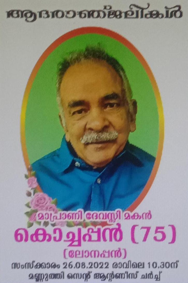 Local News മാപ്രാണി ദേവസ്സി മകൻ കൊച്ചപ്പൻ അന്തരിച്ചു By Author / August 26, 2022 Share this News മാപ്രാണി ദേവസ്സി മകൻ കൊച്ചപ്പൻ (ലോനപ്പൻ – 75) അന്തരിച്ചു. സംസ്ക്കാരം ഇന്ന് (26.08.2022 ) രാവിലെ 10.30ന് മണ്ണുത്തി സെന്റ് ആന്റണിസ് ചർച്ച് Post Views: 399 Post navigation Previous കുറ്റകൃത്യങ്ങൾക്കെതിരെ വിട്ടുവീഴ്ചയില്ല.തൃശൂർ സിറ്റി പോലീസിന്റെ സ്പെഷൽ ആക്ഷൻ ഗ്രൂപ്പ് രംഗത്ത്.Next വാണിയംപാറയിൽ ഗ്രൗണ്ട് നിർമ്മിക്കുന്നതിന് വേണ്ടി ആലോചനാ യോഗം സംഘടിപ്പിച്ചു; ആവേശത്തിൽ യുവാക്കൾ