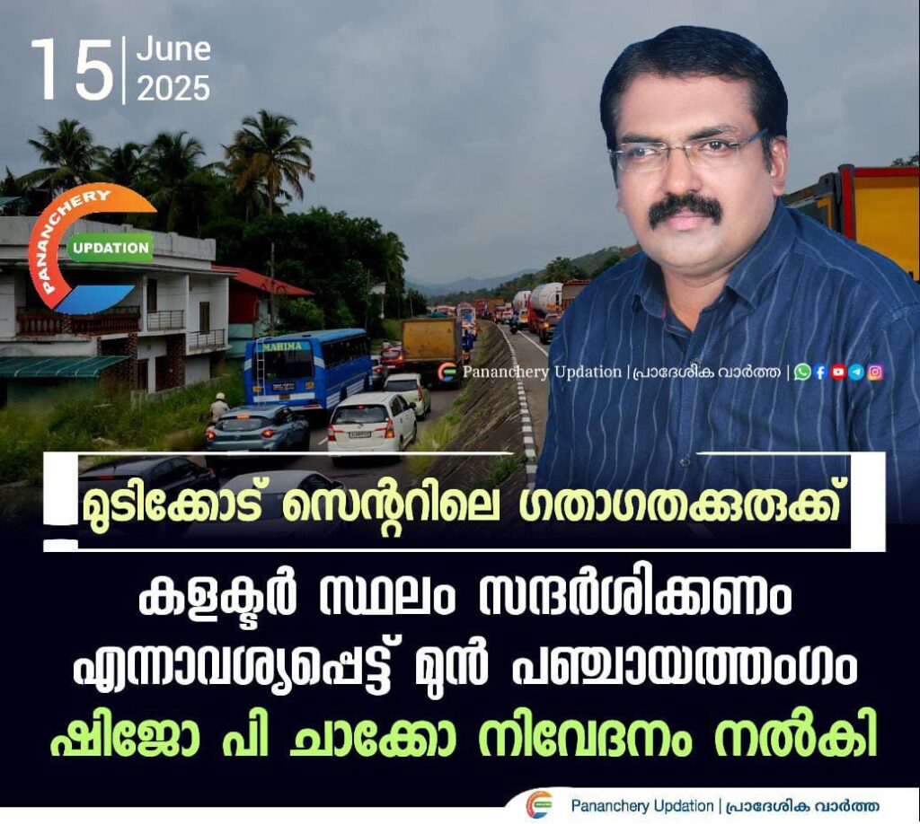 മുടിക്കോട് സെൻ്ററിലെ ഗതാഗതക്കുരുക്ക്; കളക്ടർ സ്ഥലം സന്ദർശിക്കണം എന്നാവശ്യപ്പെട്ട് മുൻ പഞ്ചായത്തംഗം ഷിജോ പി ചാക്കോ നിവേദനം നൽകി