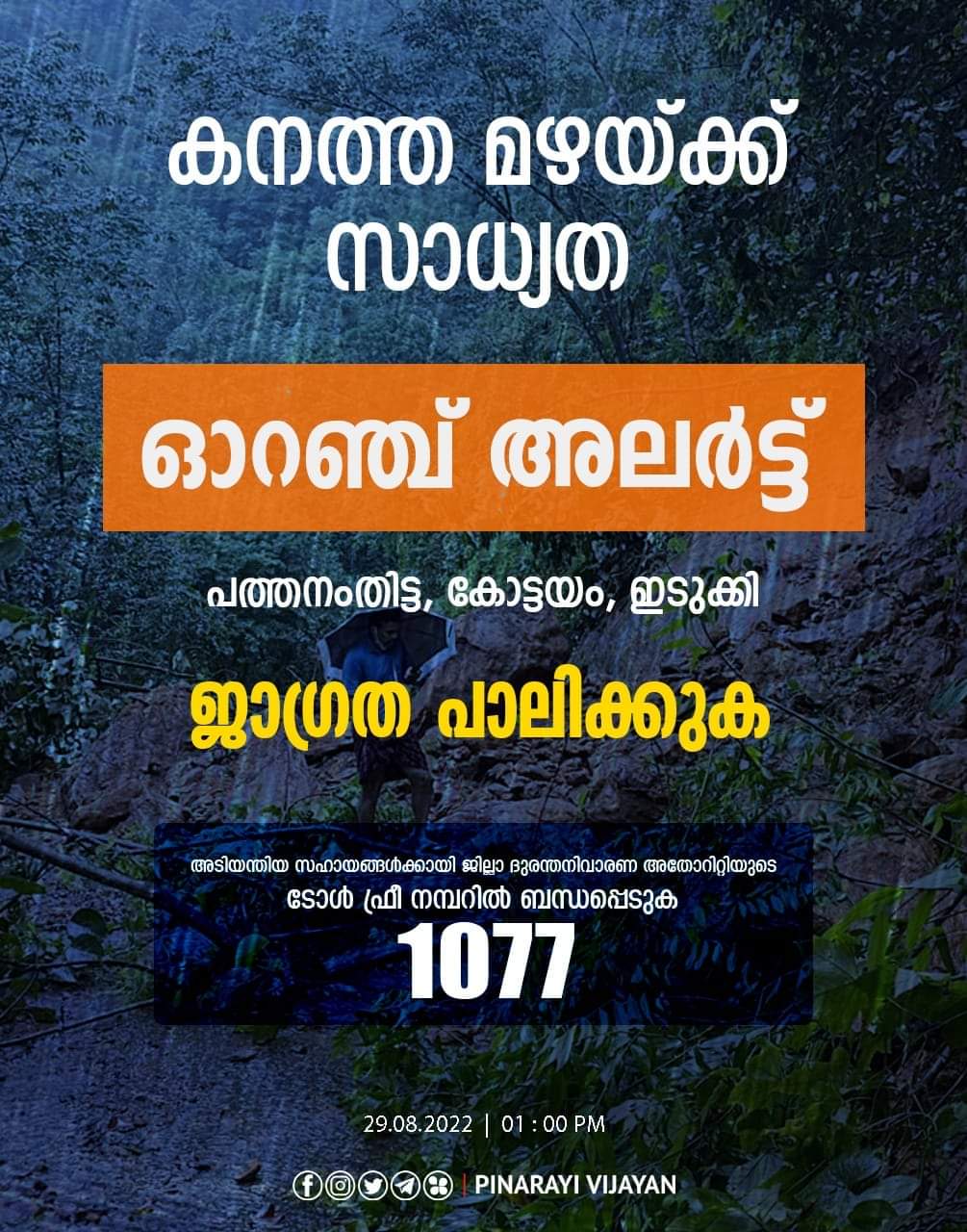 അടിയന്തിര സഹായങ്ങൾക്കായി ജില്ലാ ദുരന്തനിവാരണ അതോറിറ്റികളുടെ ടോൾ ഫ്രീ നമ്പർ ആയ 1077 ൽ ബന്ധപ്പെടാവുന്നതാണ്.