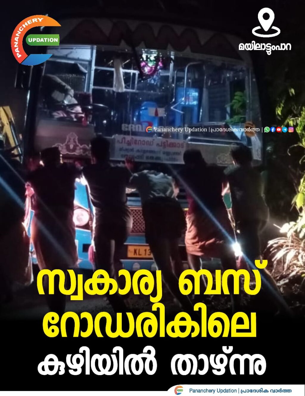 മയിലാട്ടുംപാറയിൽ സ്വകാര്യ ബസ് റോഡരികിലെ കുഴിയിൽ താഴ്ന്നു. ഇന്നലെ വൈകീട്ട് ആറുമണിയോടെ ‘അമ്മ’ ബസ് ആണ് അപകടത്തിൽ പെട്ടത്. മറ്റൊരു വാഹനത്തിന് സൈഡ് കൊടുക്കാൻ ശ്രമിക്കുന്നതിനിടെ ലിഫ്റ്റ് ഇറിഗേഷൻ പദ്ധതിയുടെ പൈപ്പ് ലൈനുകൾ സ്ഥാപിക്കുന്നതിനായി എടുത്ത കുഴിയിൽ ബസ് താഴുകയായിരുന്നു. പിന്നീട് ജെസിബി കൊണ്ടുവന്നാണ് ബസ് പുറത്ത് എടുത്തത്.