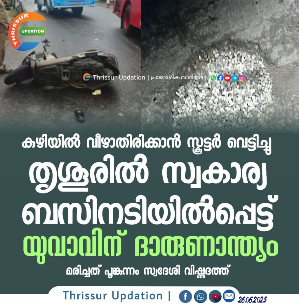 കുഴിയിൽ വീഴാതിരിക്കാൻ സ്കൂട്ടര് വെട്ടിച്ചു; തൃശൂരിൽ സ്വകാര്യ ബസിനടിയിൽപ്പെട്ട് യുവാവിന് ദാരുണാന്ത്യം