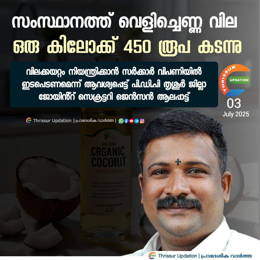 സംസ്ഥാനത്ത് വെളിച്ചെണ്ണ വില ഒരു കിലോക്ക് 450 രൂപ കടന്നു; വിലക്കയറ്റം നിയന്ത്രിക്കാന് സര്ക്കാര് വിപണിയില് ഇടപെടണമെന്ന് ആവശ്യപ്പെട്ട് പി.ഡി.പി തൃശൂർ ജില്ലാ ജോയിൻ്റ് സെക്രട്ടറി ജെൻസൻ ആലപ്പാട്ട്