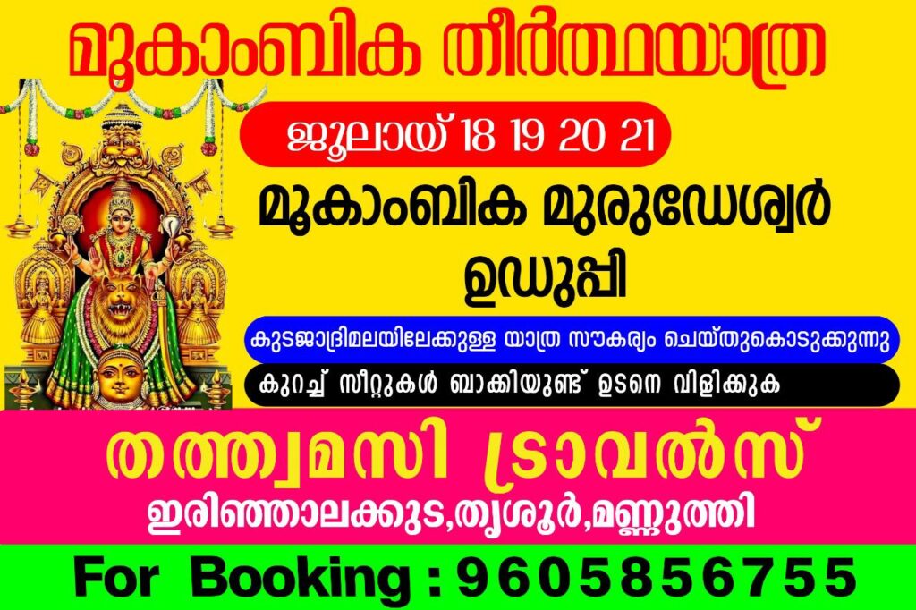 Local News മൂകാംബിക തീർത്ഥയാത്ര By Author / July 4, 2025 Share this News 📌ജൂലായ് 18, 19, 20, 21മൂകാംബിക മുരുഡേശ്വർ ഉഡുപ്പി*കുടജാദ്രിമലയിലേക്കുള്ള യാത്ര സൗകര്യം ചെയ്തുകൊടുക്കുന്നു*കുറച്ച് സീറ്റുകൾ ബാക്കിയുണ്ട് ഉടനെ വിളിക്കുക*തത്ത്വമസി ട്രാവൽസ്*ഇരിഞ്ഞാലക്കുട, തൃശൂർ,മണ്ണുത്തിFor Booking:9605856755 Post Views: 39 Post navigation Previous സംസ്ഥാനത്ത് വെളിച്ചെണ്ണ വില ഒരു കിലോക്ക് 450 രൂപ കടന്നു; വിലക്കയറ്റം നിയന്ത്രിക്കാന് സര്ക്കാര് വിപണിയില് ഇടപെടണമെന്ന് ആവശ്യപ്പെട്ട് പി.ഡി.പി തൃശൂർ ജില്ലാ ജോയിൻ്റ് സെക്രട്ടറി ജെൻസൻ ആലപ്പാട്ട്Next ഡോക്ടർസ് ഫാർമ കെയർ