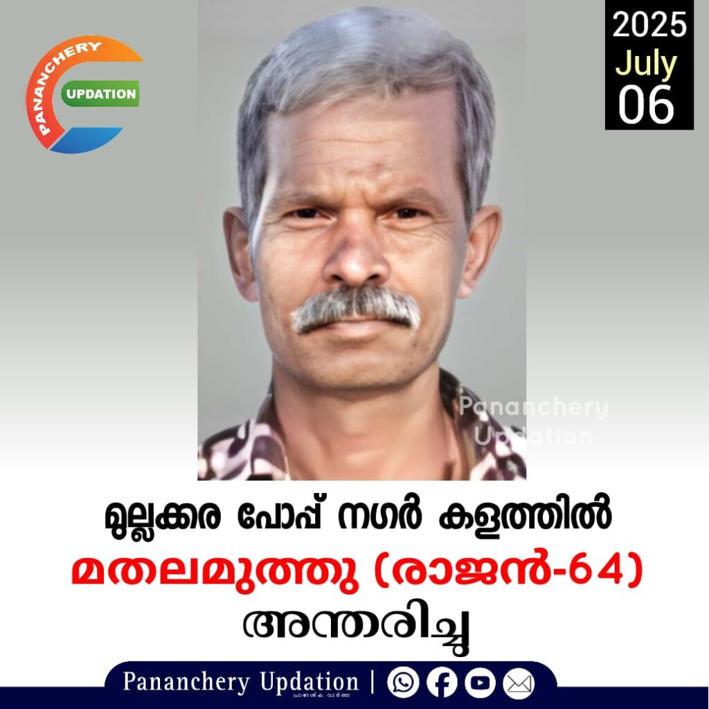 മുല്ലക്കര പോപ്പ് നഗർ കളത്തിൽ ചിന്നപ്പൻ മകൻ മതലമുത്തു (രാജൻ-64) അന്തരിച്ചു. സംസ്കാരം ഇന്ന് (06-07-2025- ഞായറാഴ്ച) ഉച്ചതിരിഞ്ഞ് 2.30ന് മുല്ലക്കര സെൻ്റ് ഇൻഫെൻ്റ് ജീസസ്സ് പള്ളിയിൽ.മക്കൾ : നീനു, നീതു മരുമക്കൾ: ലിന്റോ, റെജീഷ്